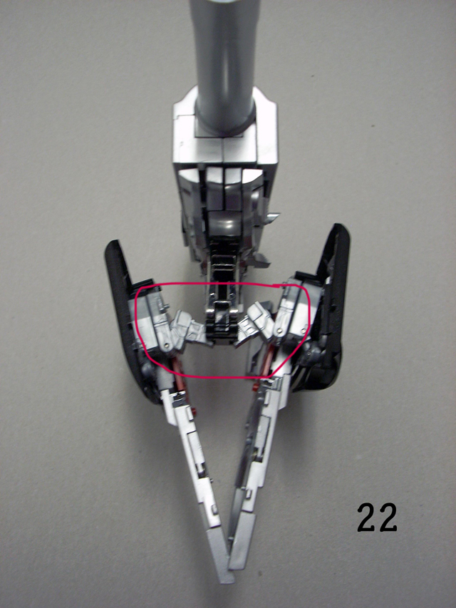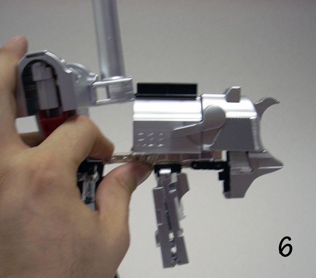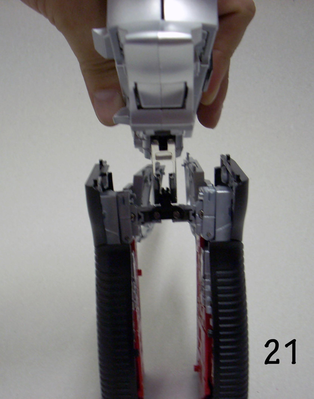 Una volta ripiegate le ginocchia su se stesse, premete sul quadratino nero mentre spingete le gambe all' interno del calcio.(fate la stessa cosa ma al contrario in fare di riconversione)Nelle foto tra la 21 e la 26 viene mostrato il corretto riposizionamento dei giunti delle gambe, è il momento più delicato fate attenzione.