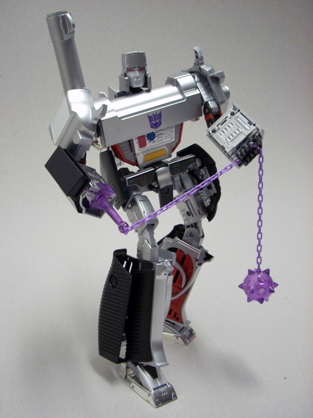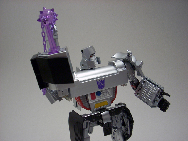 Un enorme blister in plastica racchiude il Megatron in forma umanoide, il mirino/cannone, una pistola vista nel lungometraggio a cavallo della seconda e terza stagione g1, una spada ed una mazza chiodata con catena.Tutte e tre le armi sono ben rifinite e verniciate, sia la spada che la pistola prevedono un fermo per assicurarle meglio nelle mani del Gattivone leggendario.Per utilizzare la mazza invece, come nel pm 01/04 si deve far rientrare una mano.In ultimo ma non per importanza: