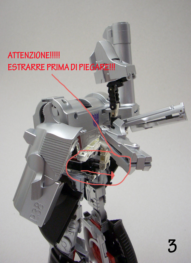 Il misero libretto allegato non è molto chiaro e a volte induce nell' errore.Usandolo in abbinamento alle foto allegate a questa recensione sarà possibile una trasformazione più serena.Se avete venti minuti liberi incominciate a trasformare Megatron partendo dalla testa, fate attenzione alla foto n. 3, molti spezzano il robot a metà perché cercano di piegarlo senza prima estrarre il trittico cromato.Andate in scioltezza fino al punto 16bis ricordandovi di aprire lo sportello e di notare quanto segnato dalle forbici in figura 15.