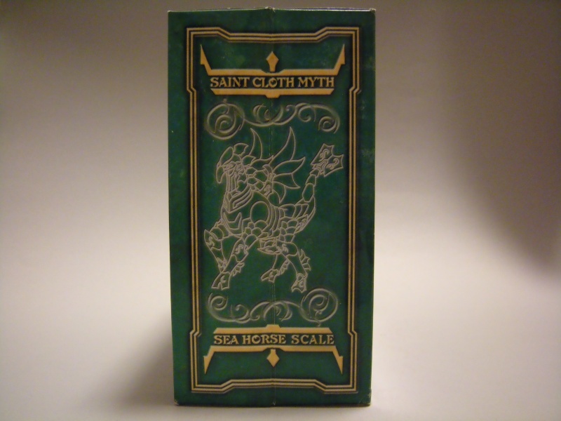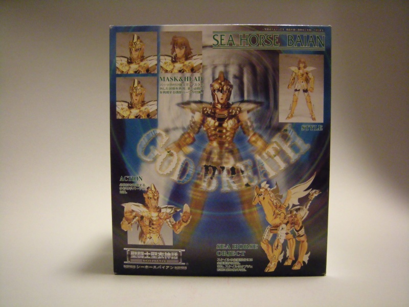 Il myth di Sea Horse si presenta nella classica scatola a libro con vetrinetta. Il montaggio delle parti dell’armatura sul personaggio non presenta problemi. La linea dei Marina è stata sviluppata fra quella dei Gold Saint e degli Specter, percui ha soluzioni tecniche che fanno da ponte fra le due caste. Le armature sono molto più snelle e calzanti delle gold, con elmi studiati per essere molto aderenti al viso, ma gli snodi sono ancora di vecchia generazione. Per quanto riguarda Sea Horse, c’è da segnalare un problema cronico che riguarda tutti i myth che hanno armature molto pesanti, soprattutto alle gambe. Essendo gli snodi delle anche a semplice attrito, non è possibile allargare più di tanto le gambe, pena la caduta del personaggio. Il myth è dotato di un secondo volto rappresentante Baian nell’atto di soffiare con la bocca, posa che identifica il suo colpo segreto “God Breath”, ed una coppia di mani per la posizione della barriera. In generale è un soggetto molto fedele alla controparte animata, salvo i capelli che appaiono più una reinterpretazione di Bandai che non una trasposizione di quanto si può vedere sullo schermo. In dotazione al personaggio è presente anche un mantello blu (nell’anime in realtà appariva bicolore, da una parte bianco e dall’altra blu), oggetto che lo caratterizza molto, dato che solo tre Marina ne sono forniti.