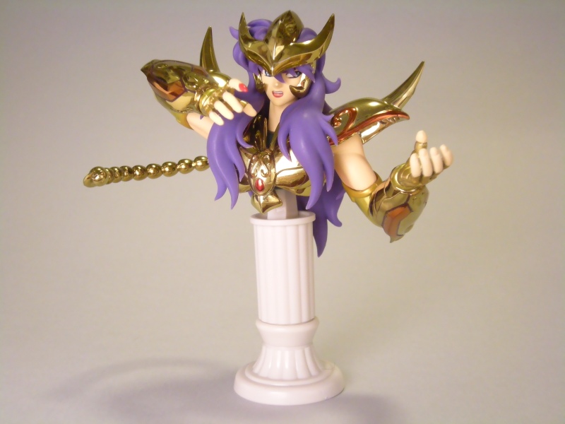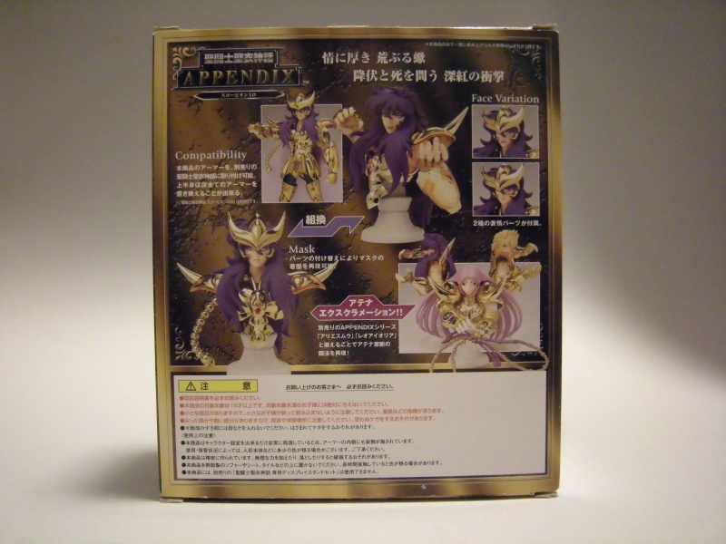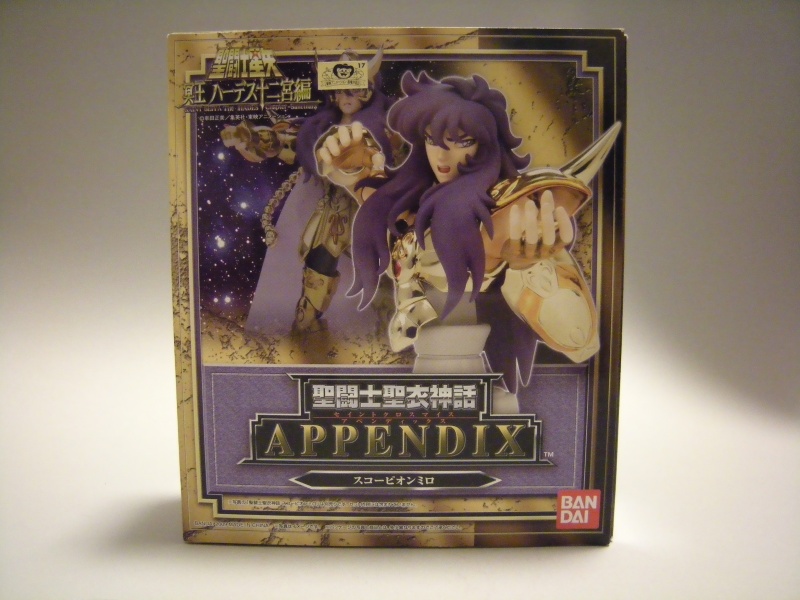L'Appendix di Scorpio non nasce solo per migliorare il volto del personaggio rispetto alla sua uscita regolare, ma anche per aggiornare tecnicamente la cloth e presentarla secondo l'aspetto che ha in Hades Sanctuary. Difatti ci sono due modalità di rappresentazione: una senza braccia con sguardo rivolto in avanti e uno con le braccia nella posa dell'Athena Exclamation e il volto con lo sguardo rivolto a sinistra. Ovviamente è possibile decidere quale volto combinare con o senza elmo, con o senza braccia, ecc... In questa versione la coda dello scorpione annessa all'elmo è sagomata fissa e si può solo decidere se orientarla a destra o a sinistra. Inoltre se si decide di rappresentare la posa dell'Athena Exclamation è possibile allungare il piedistallo espositivo con una colonna, in modo da dare a Milo una posizione rialzata simulando la postura che si trova ad avere rispetto a Mu dell'Ariete. Per quanto riguarda l'applicazione delle parti del busto sul corpo del vecchio myth, ci troviamo di fronte a un dispiegamento di forze eccezionale. Difatti sono utilizzabili tutte le parti. Non solo, nella confezione è inclusa anche il pezzo dell'armatura che va a coprire la vita, inutilizzabile nel busto ma indispensabile sul myth, dato che con la sua nuova forma armonizza al meglio la disposizione delle frange del gonnellino. Oltre a quelle in modalità Athena Esclamation, la dotazione vede anche la presenza di due mani destre con scarlet needle: la classica con dito indice teso e una con dito indice incurvato.