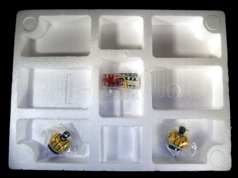 La scatola è interamente occupata da un grosso contenitore in polistirolo all’interno del quale trovano alloggiamento i vari componenti separati nei singoli segmenti. Sul versante principale, chiuso da un tappo in polistirolo, troviamo pertanto, contenuti ciascuno nella relativa bustina protettiva di plastica trasparente: un busto scomposto in testa, torace, addome e bacino; le earth parts suddivise in gambe, cosce, ruote dentate, braccia e trivelle; le sky parts divise in gambe, cosce, ali, missili e modulo di volo; le gambe, cosce, braccia, missili subacquei ed avambracci delle marine parts. Sul versante opposto al vano principale troviamo, contenuti nella relativa busta di plastica ed ancorati al polistirolo con una semplice striscia di scotch, i due busti aggiuntivi (già composti ed in tutto e per tutto uguali, quindi calamitati, a quello reperibile sul lato principale) e le griglie a supporto dei tappi coprivite (per quanto riguarda questi ultimi non credo che sarebbe stato chissà quale problema aggiungere i tappi per i busti aggiuntivi, che viceversa non sono stati inseriti). Le istruzioni, come da tradizione CM’S, sono sintetizzate sull’abituale, sbrigativo foglio a colori piegato in quattro parti e stampato su entrambe i lati (a quando un bel libretto in stile Bandai o Max Factory? Attendiamo risposta anche da Fewture…..)