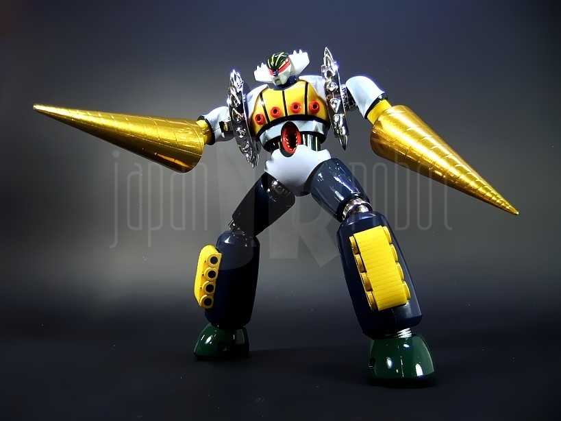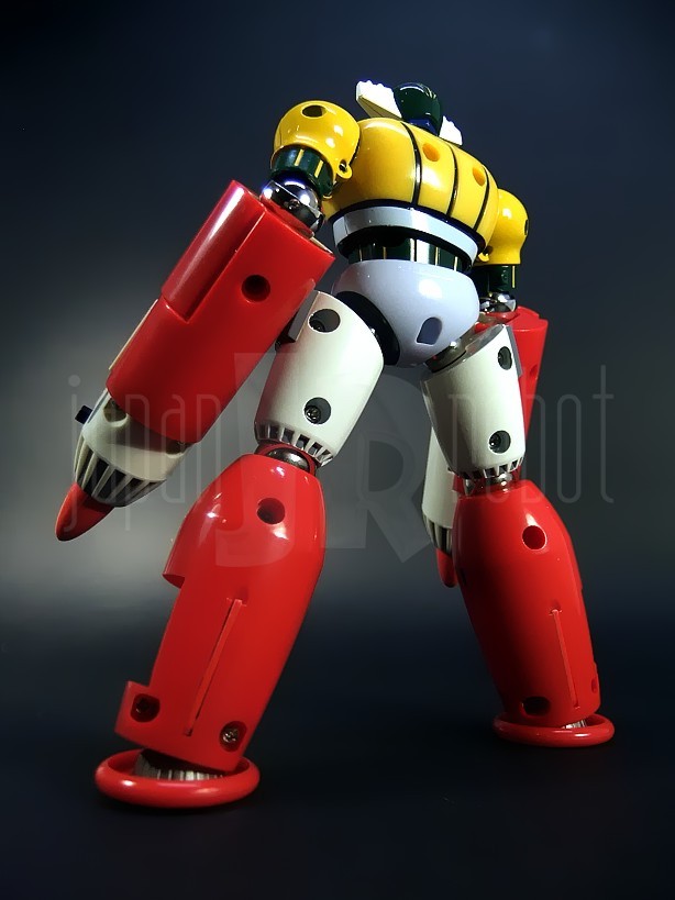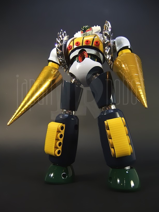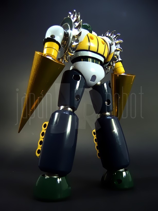 Partiamo col dire che se acquistate il modello e già possedete il Brave Gokin 36, potete scordarvi un busto analogo a quello del suddetto gokin, e cioè ricco di metallo ben pesante e lucente. I tronchi a corredo di questo Brave Gokin, verosimilmente per motivi di stabilità, sono infatti stati realizzati interamente in plastica, e si vede, non solo per il peso….. Per accettabili e ben verniciati che siano, infatti la differenza è abbastanza chiara, già a partire dal colore del torace che tradisce molto chiaramente la composizione in plastica. Insomma, il giallo non è certo quel bel colore vivace tipico del metallo verniciato che abbiamo potuto apprezzare nel Jeeg, ma risulta decisamente più smorto. Se possedete entrambi i modelli vi invito a fare questo confronto. Nelle Earth Parts (missili superperforanti in italiano) sono di metallo le cosce e le braccia, tutto il resto (piedi e gambe, trivelle, ruote dentate e tronco) è in plastica. Il peso alla fine e tutto sommato, per una altezza di 16.5 cm, non è neanche così male (295 grammi, principalmente conferiti dalle cosce che insieme da sole ne costituiscono oltre un quarto). La verniciatura sia per le parti metalliche che per quelle plastiche, come da tradizione CM’S, è ben curata e soddisfacente, così come lo sono alcuni dettagli (vedi i nastri cingolati mobili in gomma sulla parte anteriore delle gambe, anche se trasmettono una certa sensazione di fragilità...). Anche la differenza cromatica tra parti a composizione diversa ma dello stesso colore (leggi gambe e cosce) tutto sommato non si apprezza molto se non nel differente grado di opacità dei materiali. Discutibile la scelta dell’oro opaco per la verniciatura delle trivelle. La stabilità è abbastanza buona, e la notizia non è da sottovalutare viste le esperienze dei passati magnetici CM’S (Jeeg compreso). Di fatto la sensazione è che in questo caso si debba giocare con gli equilibri del modello molto meno di quanto non si sia chiamati a fare con i precedenti calamitati CM’S per dare stabilità alle pose, complice la superficie d’appoggio gommata dei piedi. Viene comunque da chiedersi perché i pesi siano stati distribuiti in modo così apparentemente irrazionale. In altre parole mi domando (senza peraltro trovare una risposta se non nell’abbattimento dei costi di produzione) perché non si siano volute realizzare anche le gambe e i piedi in metallo, cosa che, oltre ad essere fattibilissima, avrebbe conferito una stabilità ancora migliore al modello (e dato maggior soddisfazione a noi collezionisti). Per quanto riguarda le articolazioni ve ne sono pochissime a scatto (fanno eccezione le spalle dove oltre alla calamita intervengono i dentini che, sulle ruote dentate, si ingranano con quelli delle spalle). Se infatti è intuitivo come i punti di snodo calamitati debbano essere giocoforza ad attrito, trovo poco condivisibile l’uso di semplici snodi a sfera a livello delle caviglie (se si tirano i piedi si staccano tranquillamente) dove l’articolazione a scatto avrebbe potuto offrire maggior stabilità e tenuta nel tempo. La posabilità nel complesso è modesta, le caviglie si inclinano poco e le ginocchia non arrivano a piegarsi neanche a 45 gradi. Le anche avrebbero potenzialmente dei buoni movimenti di abduzione nonché di flessione ed estensione, ma tutto viene praticamente vanificato dall’ipomobilità delle articolazioni poste a valle. Il tronco ha modesti movimenti di torsione al passaggio addome-bacino e di inclinazione allo stacco bacino-torace. La testa ha escursioni limitate in torsione laterale (così come nel Jeeg) e discreta estensione (fondamentale in questo caso per la simulazione delle pose in assetto orizzontale). Le ruote dentate possono ruotare e si è scelto di realizzarle con le punte su di esse direzionate in senso opposto (anche se nell’anime a onor del vero avevano inclinazione analoga o opposta a seconda del fotogramma). Nella parte interna della loro porzione bianca sono riportate delle lettere, in alto rispettivamente L (left) e R (right) per dare indicazioni sul lato di applicazione ed in basso, su entrambe, le lettere F (front) e R (rear) per suggerire quale parte posizionare frontalmente e quale posteriormente. Le spalle, che si agganciano sul tronco con un sistema calamitato, si articolano con le ruote dentate grazie a dei dentini di plastica analoghi alla soluzione già adottata nel Jeeg. Si abducono con un sistema a scatto a 90 gradi e ruotano liberamente a 360 gradi. Le trivelle, dotate di calamite, si agganciano agli avambracci con un sistema ad incastro con la costante conseguenza che, quando le si rimuove la calamita resta regolarmente attaccata al braccio stesso.