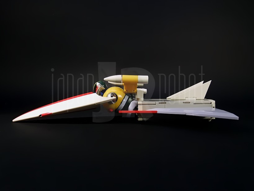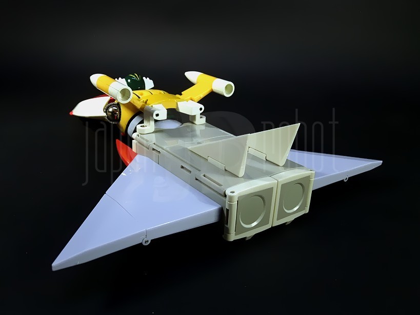 Chiudiamo la nostra carrellata su questo modello con l’analisi del modulo aereo. Di queste sono in metallo i piedi e le cosce, per il resto, fatta eccezione per alcuni dettagli in metallo del modulo da applicarsi sulla schiena (la parte gialla centrale), i restanti segmenti sono di plastica. Il peso supera quello di Earth Parts e Marine Parts essendo pari a 271 grammi, ma a onor del vero a differenza delle due suddette configurazioni, in questo caso il “trabiccolo” sulla schiena gioca dal punto di vista ponderale un ruolo decisamente significativo. Ancora una volta si conferma l’ottima verniciatura, la relativa mancanza di segni di distacco dalle sprue sulle plastiche e l’uniformità cromatica di gambe e cosce nonostante la diversa composizione. La stabilità è assai precaria se l’aliante è agganciato alla schiena (difficilmente si tiene in piedi se non sfruttando l’appoggio del modulo stesso a terra), in sua assenza è viceversa più che accettabile. Anche in questo caso è stata gommata la pianta dei piedi per fornire maggior presa al piano di appoggio. Per la posabilità si conferma in parte quanto sinora già detto per parti terrestri e subacquee, nel senso che forse è leggermente migliore per una maggior mobilità delle caviglie, ma rimane comunque limitata in corrispondenza delle ginocchia con anche pertanto ben mobili ma non funzionali. La trasformazione dell’aliante sulla schiena è peraltro ingegneristicamente assai valida e divertente da realizzare (anche se ci si perde nel bicchier d’acqua di un aggancio alla vita del robot a dir poco approssimativo). Anche in questo caso CM’S non ha comunque mancato di omaggiarci di un scelta tecnica a dir poco rischiosa ed agghiacciante. Quando si introducono le gambe dentro al modulo per la trasformazione in “aereo” è necessario ripiegare i piedi di 90 gradi sull’interno gamba. Questo movimento è svolto da un perno in plastica molto rigido, apparentemente esile e governato da uno snodo a scatto per cui ogni volta che si aziona questo sistema si ha la netta, sinistrissima sensazione che ad ogni scatto il nostro perno rischi di rimanerci spezzato in mano da un momento all’altro. Personalmente ho praticato questa manovra almeno 3 volte e fortunatamente non è mai successo nulla, ma se volete un parere in materia, vi sconsiglio vivamente di sfidare la sorte per cui mi limiterei a non più di un solo tentativo giusto per capire la modalità di trasformazione. In questo più che in altri modelli CM’S si rende stridente la mancanza di uno o più stand espositivi i quali (vista la possibilità di assetti orizzontali non solo per le Sky Parts ma anche per gli altri due moduli) sarebbero stati più che mai doverosi e graditi. Anche da questo punto di vista valgono pertanto le considerazioni già fatte per le istruzioni, ma evidentemente CM’S da questo orecchio pare proprio non volerci sentire.