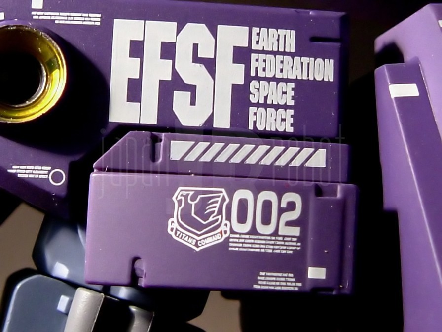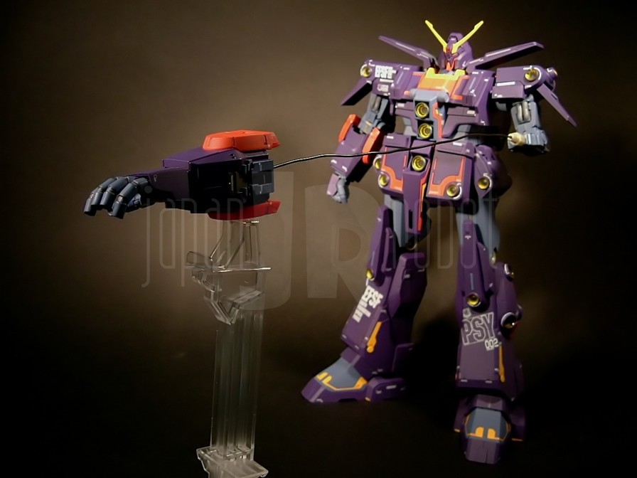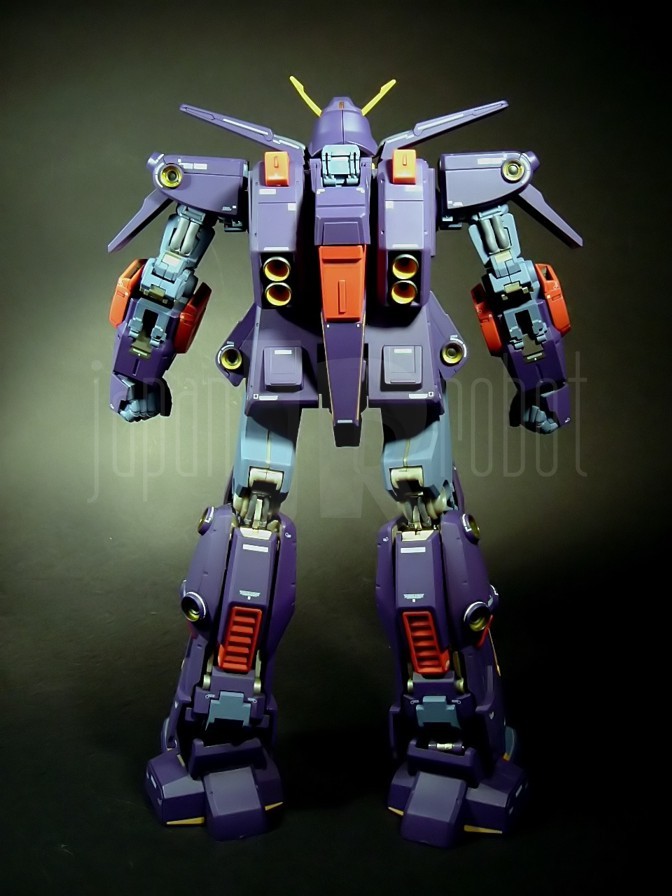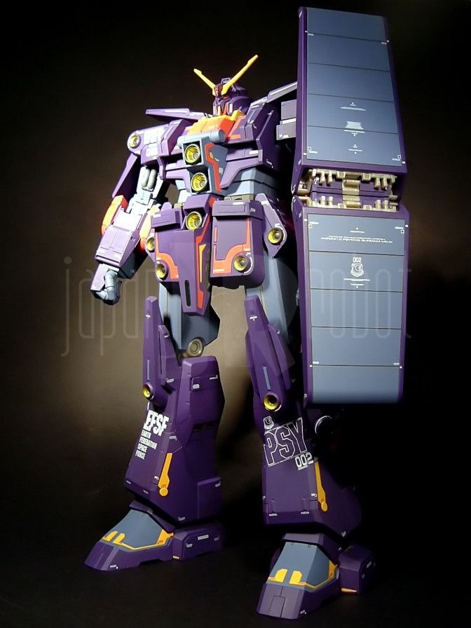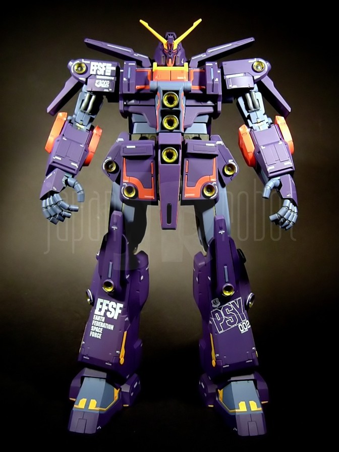 Pur non essendo un macigno il nostro Psycho si caratterizza per il fatto di essere probabilmente il più Metal tra i vari Metal Composite. Se infatti tale definizione è spesso considerata un'esagerazione visto l'esiguo contenuto in parti metalliche dei soggetti riprodotti per questa serie, in questo caso, nonostante la corazza esterna sia come al solito interamente in plastica, sono ben evidenti le componenti in zama che si rivelano in modo chiaro nel corso della conversione a fortezza volante concentrandosi principalmente in corrispondenza dello scheletro delle gambe, degli snodi di ginocchia, anche e spalle e parzialmente all'interno del tronco per un peso complessivo di 724 grammi che, se per un modello di 29 cm (ebbene si, sono 29 cm di altezza all'apice del fregio) è relativamente contenuto, nel complesso non risulta comunque così esiguo. La posabilità del modello, come nel suo predecessore, è molto limitata, in queso caso forse ancora di più. La cosa fortunatamente non disturba più di tanto data la relativa staticità della controparte animata. Le caviglie hanno buoni movimenti di inclinazione laterale ma scarsa capacità di flessione. Purtroppo le discrete escursioni laterali sono parzialmente vanificate dalla modesta abduzione delle anche. In parte si può ovviare a questo inconveniente tramite la rotazione laterale dell'intero arto inferiore (movimento consentito a livello dell'anca) in modo da permettere alle gambe di divaricarsi un po' di più. Le ginocchia, unica articolazione a scatto del modello, si flettono a non più di 30 gradi. I sei elementi del gonnellino (2 anteriori, 2 laterali, 2 posteriori) sono mobili grazie alla presenza di piccoli perni snodati che li ancorano al bacino. Il tronco è un blocco unico e privo di snodi, cosa intuibile dati i limiti imposti da una trasformazione che ne richiede la completa apertura. Le spalle ruotano totalmente ed hanno modestissimi movimenti di abduzione. Le braccia sono rotabili di 360 gradi sull'asse longitudinale ed i gomiti si flettono a 90 gradi. Gli avambracci sono staccabili permettendo così la simulazione delle beam swords (nell'anime venivano usati come armi a distanza sparabili che rimanevano ancorati alle braccia tramite cavi). Carino il fatto che la testa sia sganciabile proprio come nell'anime, è regolata da un perno che si articola alla base della testa con un sistema a sfera agganciandosi all'estremo opposto al tronco con un attacco calamitato. Ha movimenti limitatissimi, sia lateralmente quanto in flessione. Il fregio sulla fronte è intercambiabile, quello che troviamo già montato è di pvc morbido ed è questo che consiglio di tenere inserito per minimizzare il rischio di antipatiche rotture. L'altro fregio montabile ha invece il vantaggio di non piegarsi essendo in plastica rigida ma proprio per questo è a maggior rischio di eventuali rotture accidentali. Le mani sono appena due paia (due pugni chiusi e due con dita snodate a livello dell'attacco alla mano). Entrambe hanno perni snodati alla loro base così da permettere i movimenti di flessione rispetto all'avambraccio. La trasformazione in fortezza volante è tecnicamente concepita in modo ineccepibile, non si discosta minimamente dalla analoga conversione praticabile nel suo predecessore e come in quel caso, una volta ultimata, lascia molto dubbiosi sull'estetica di quanto ottenuto con tanta ingegnosa maestria. In altre parole, così come l'MRX-009, in MA mode anche l'MRX-010 somiglia a qualcosa di più simile ad un climatizzatore portatile che non a una minacciosa base volante. La raccomandazione sempre valida rimane comunque quella, qualora si volesse praticare la conversione (ne può sicuramente valere la pena almeno per valutare il validissimo lavoro ingegneristico fatto da Bandai), di fare molta attenzione nello sfregamento delle varie parti che inevitabilmente si viene a verificare, pena il rischio di fastidiosisime rigature della vernice. La verniciatura, appunto! Proprio questa è a mio modo di vedere il vero punto di forza del nostro modello. Bellissimo l'accostamento dei 4 colori dominanti (viola, rosso, giallo, azzurro) per un risultato cromatico decisamente accattivante e valorizzato dall'estrema precisione con cui sono stati curati anche i più piccoli dettagli, dalle pannellature degli inserti rossi alle markerizzazioni più minute che un po' ovunque impreziosiscono lo Psycho, il tutto in assenza di grossolani difetti. Bruttina invece la parte centrale dello scudo dove, una volta unite le due metà, sono evidenti elementi grigi non verniciati che stonano e non poco con la colorazione viola delle parti circostanti. Un peccato, visto e considerato che verniciatura a parte si tratta comunque di un prodotto asai curato anche in tutti gli altri dettagli, vedi i tappi coprivite sulla superficie interna delle cosce.