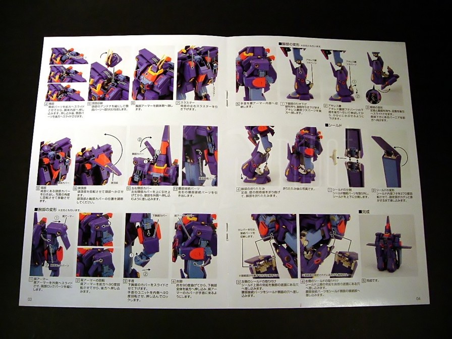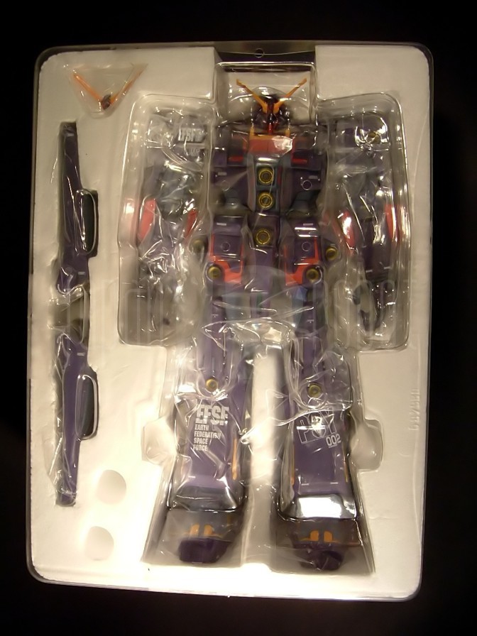 La scatola è interamente occupata da un grande contenitore di polistirolo dotato di alloggiamenti su ambo i versanti. Il contenuto è assicurato nelle relative sedi da due grossi coperchi di plastica trasparente bloccati al contenitore da grandi strisce di scotch. Sulla faccia anteriore sono sistemati il modello (protetto dal contatto col polistirolo e col coperchio da due fogli di plastica e due sacchettini che rivestono le braccia), le due metà dello scudo contenute in apposite bustine di plastica ed il fregio frontale rigido (quello preapplicato è in pvc morbido) intercambiabile. Sul versante posteriore troviamo invece sistemati la basetta espositiva, i due tappi per l'ancoraggio dei piedi del modello ad essa ed il braccio con relativo sostegno per l'esposizione in sospensione in modalità MS, la placchetta per l'unione delle due metà dello scudo, un paio di pugni chiusi e due cavi per la simulazione delle beam swords. Al di sotto della basetta sono inoltre riposti, in una bustina di plastica, due telaietti cui sono ancorati degli elementi a forma di elica tra loro agganciabili per riprodurre (mia supposizione) un'arma non meglio precisata. Il libretto, come sempre presente, è scarno ma chiaro nella sua essenzialità, e comunque è in linea con quelli dei precedenti Metal Composite.