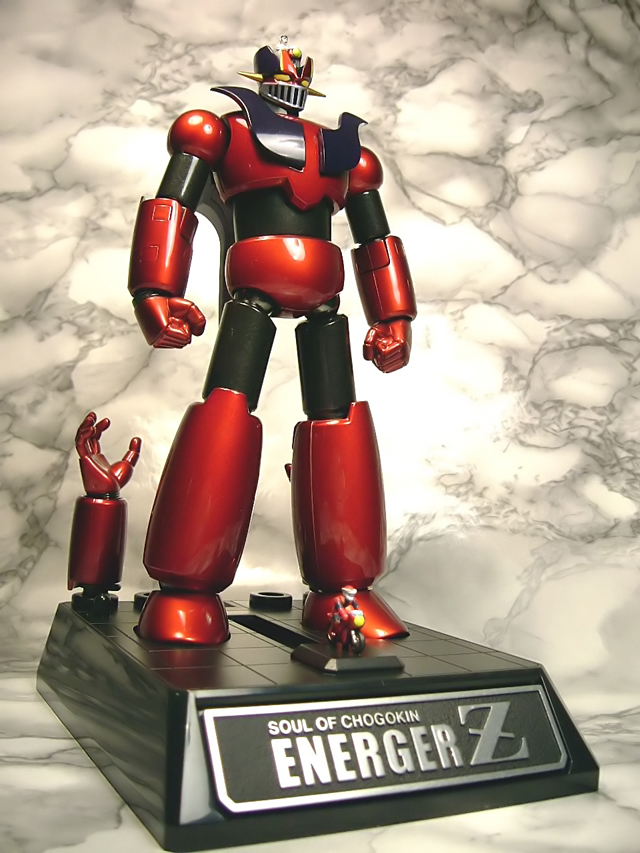 Strutturalmente è analogo al gx-45, per cui da esso non differisce ne' in altezza (16 cm) ne' in peso (340 grammi). Le uniche parti in plastica sono piedi, avambracci e testa, tutto il resto è di metallo. La posabilità, come per il gx-45, è a livelli estremi: le caviglie, estraibili, hanno ampissime escursioni e le ginocchia, a scatto, si flettono oltre i 90 gradi consentendo pose in ginocchio. Il sistema articolare delle anche ha la struttura ormai sdoganata da Bandai col precedente Mazinga Z e che prossimamente rivedremo nel gx-51 Getter Dragon ed è costituito da due snodi a sfera in parte abbassabili così da assicurare ampi movimenti laterali e grosse escursioni in ogni direzione. L'addome ruota rispetto al bacino ed il torace si flette sull'addome oltre ad avere movimenti di basculamento laterale. Le spalle, a scatto, hanno totale libertà di movimento ed i gomiti, ad attacco calamitato, si flettono oltre i 90 gradi. A differenza del gx-45 che presentava nella eccessiva lassità in rotazione degli avambracci sulle braccia uno dei difetti principali, nel mio esemplare di Energer non ho rilevato tale difetto e l'articolazione ha presentato una tenuta sufficiente. Belli i polsi, ben snodati e tali da permettere ampi movimenti di flessione ed estensione. La testa si flette ed estende ampiamente e ruota liberamente a 360 gradi. La verniciatura del modello rappresenta in verità il suo reale punto di forza. Inizialmente mi ha lasciato interdetto ma con il tempo, una volta che l'occhio si è abituato e dopo aver visto i relativi episodi dell'anime, devo ammettere che ha finito per piacermi sempre di più. Le foto in realtà non rendono ragione alla sua bellezza, apprezzabile solamente osservando il modello dal vivo. Il rosso scuro metallizzato di gambe, avambracci, bacino e torace, si accosta perfettamente al viola delle piastre pettorali e al colore di addome, cosce e braccia, una via di mezzo tra un grigio antracite ed un nero brunito metallizzato. In questo insieme di colri risulta azzeccato anche il giallo degli occhi e degli inserti sulla testa. Nel mio esemplare non ho notato difetti particolari di verniciatura se non la presenza di piccoli segni di distacco dalle sprue sul margine inferiore della faccia posteriore dei piedi. Le miniature, data la esiguità di dimensioni sono tutto sommato ben realizzate anche se, volendo fare i pignoli, solo quella di Kenzo Kabuto ha senso dal momento che nell'anime Tetsuya non monta mai a bordo di un Energer con questi colori ma bensì con i colori classici (quelli dello 07E tanto per intenderci). Il set di accessori è relativamente scarno,