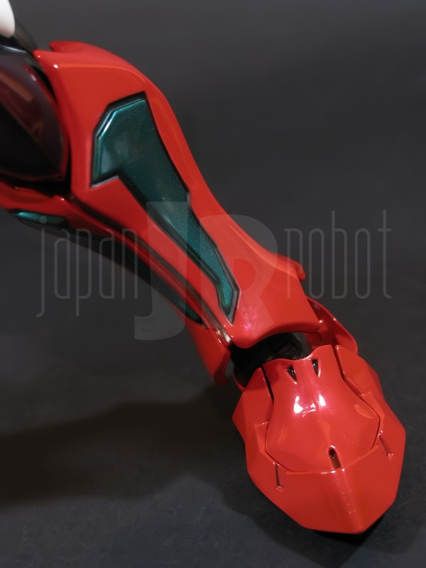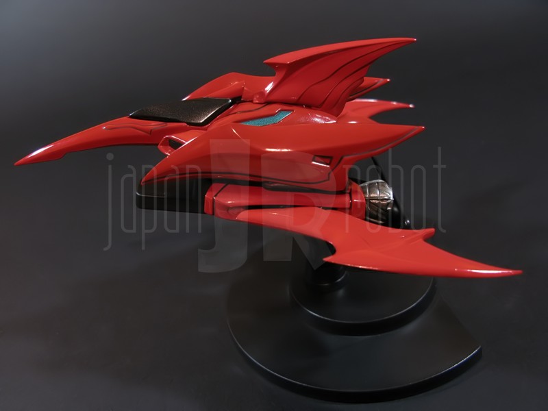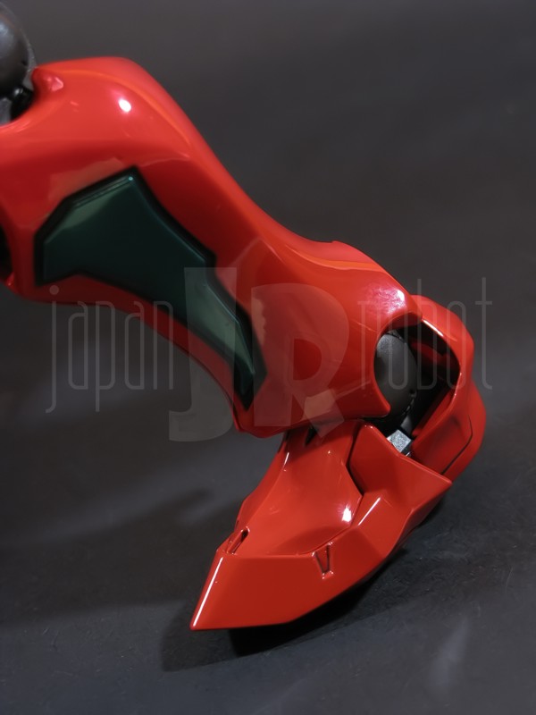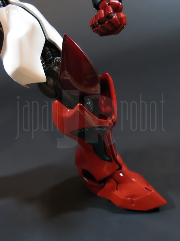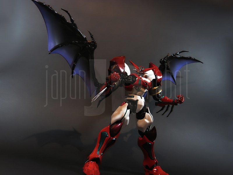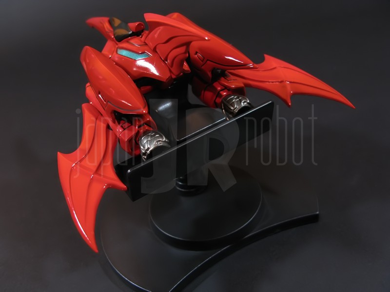Come si estrae il modello e lo si soppesa se ne evince la abituale, estremamente lusinghiera e soddisfacente sensazione di pesantezza che caratterizza tutti i gokin di questa serie, già di per se indicativa di una composizione quasi integralmente in metallo. Fatta eccezione per testa, pugni, ginocchiere, dischi sulle braccia e giunture e ingranaggi a vista (vedi anche, spalle e gomiti), il nostro Shin Getter 1 è infatti totalmente in lega metallica, almeno per quanto riguarda le parti esposte. La politica adottata, anche per la strutturazione di questo modello così come per i precedenti Getter Fewture, è stata quella dello scheletro in plastica di sostegno ad un rivestimento esterno in zama, aspetto che non lascerebbe presagire niente di buono visti i problemi dei famigeratissimi predecessori, tanto criticati per falle più o meno clamorose (Getter 1 e Getter 2 in particolar modo) anche se in questo caso mi sento di essere più fiducioso visto l’uso di plastiche apparentemente più solide e di miglior qualità e l’impiego di viti (indicato dalla presenza di azzeccatissimi tappi ben visibili sulla schiena del robot) a solidificare la struttura del gokin. L’assemblaggio è estremamente semplice e rapido, è sufficiente applicare a pressione le lame sugli avambracci (ciascuna mobile in modo indipendente e regolata da uno snodo a sfera), la testa, il generatore getter, le due piastre pettorale e addominale, le ali e le due ginocchiere. Una volta assemblato il modello (completo di ali), ha un peso di 1060 grammi per un’altezza all’apice delle spalle di 26 cm scarsi che arriva ad un culmine di circa 43 cm alla punta delle ali se rivolte verso l’alto. La mobilità del modello è semplicemente eccezionale e garantita da un’infinità di punti di snodo che consentono anche le pose più estreme (vedi la possibilità di metterlo in ginocchio) a dispetto delle forme relativamente elaborate e della stazza decisamente imponente. L’avampiede è flessibile con movimento a scatto, le caviglie hanno discreta inclinazione e modesta rotazione lavorando in tal senso come articolazioni ad attrito e funzionando invece con sistema a scatto in estensione (peraltro buona). Le gambe ruotano leggermente lungo l’asse longitudinale (la sinistra del mio in realtà era bloccata ed ha necessitato di una piccola iniezione di lubrificante). Le ginocchia sono estremamente flessibili e regolate da snodi a scatto, il consiglio è quello di porre particolare attenzione ai rischi di sverniciatura nelle flessioni estreme, quando cioè la parte superiore della faccia posteriore della gamba rischia di andare in contatto con la parte bassa della faccia posteriore della coscia. L’articolazione dell’anca presenta ottime escursioni sia in abduzione che in flessione, agendo su ambo i piani con sistema a scatto. L’intero arto inferiore è peraltro abbondantemente intra ed extrarotabile all’altezza della coscia. Buoni i basculamenti laterali del torace, più limitati i movimenti di torsione, ad ogni modo occhio alle eventuali sverniciature della piastra pettorale nel caso di contatto col bacino, rischio da cui lo stesso foglio delle istruzioni mette in guardia. Le spalle sono ripiegabili in avanti ed estensibili posteriormente con sistema ad attrito mentre in rotazione (peraltro completa) ed in abduzione (pari a non più di 90 gradi) lo snodo si comporta come articolazione a scatto. Gli stessi inserti marroni sulle spalle sono mobili e ripiegabili medialmente a scatto. I gomiti, anch’essi a scatto, si flettono a circa 90 gradi, mentre gli avambracci sono liberamente ruotabili lungo il loro asse longitudinale. Addirittura i polsi (forse un po’ troppo esilini) sono a scatto e danno la possibilità di flessioni estreme alla mano. La testa è invece supportata da uno snodo a sfera che, oltre a consentire la rotazione completa a 360 gradi, permette ottimi movimenti di flessione ed estensione anche per effetto della mobilità della base di impianto. Nel complesso, oltre all’ottima posabilità, è confortante constatare la ricchezza di articolazioni a scatto, teoricamente in grado di garantire una maggiore tenuta in prospettiva futura, fondamentale per un gokin così pesante rispetto ai più semplici e col tempo logorabili snodi ad attrito. La qualità della verniciatura è nel complesso estremamente buona, comunque più alta, almeno in questo esemplare, rispetto alla media da me rilevata nei precedenti Ex Gokin. Se infatti si escludono alcuni ritocchi di vernice bianca sulla schiena (difetto peraltro lamentato anche in altre copie e da più di una persona) e piccole imperfezioni degli inserti verdi sulle gambe per il resto non ho dovuto registrare altri problemi di seppur minimo rilievo ma ho trovato anzi molto bella la tonalità di verde smeraldo tenuemente metallizzato impiegata e soprattutto stupende le sfumature del marrone metallizzato di ginocchia e spalle. Sempre rimanendo in tema di verniciatura non ho invece ben compreso, pur trovandola bella, la colorazione invecchiata in stile weathering delle varie paia di mani che però tendono a stonare su di un modello per il resto completamente “pulito”, ivi compresi gli accessori. Quanto all’estetica il giudizio per questi modelli più che per altri diventa difficile ed opinabile essendo strettamente legato al gusto personale ed indipendente dalle necessità di somiglianza ad una controparte animata in questo caso inesistente. Personalmente trovo che questo Shin Getter 1 abbia linee discretamente azzeccate seppur migliorabili, in particolar modo dalla cintura in giù, là dove avrei cioè auspicato un rapporto coscia-gamba più vicino al soggetto ispirante con gamba più massiccia e coscia più sottile a differenza dell’aspetto da simil culturista che una coscia eccessivamente ipertrofica, in associazione a una gamba troppo snella, tendono a conferirgli. Fa invece discutere riportando alla memoria alcuni mostri tipici della mitologia giapponese, la s