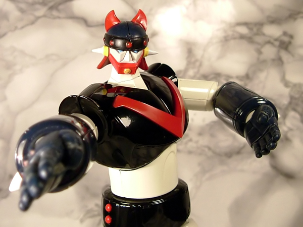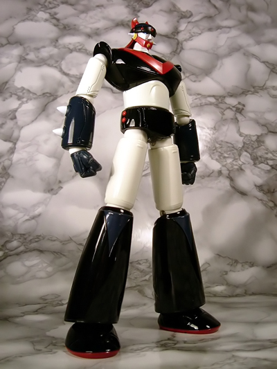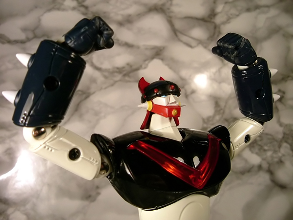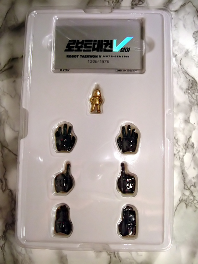 - un blister con base in plastica bianca e coperchio in plastica trasparente conenente una targhetta indicante il numero progressivo del modello (il mio è l'esemplare numero 1305) e il nome del robot con la grossa V di colore cangiante a seconda dell'incidenza della luce, tre paia di mani (uno con dita estese per le pose da karateka, uno con indice puntato e uno con dita piegate ad artiglio) e una figurina in metallo di un personaggio dell'anime da posizionare sulla basetta espositiva.