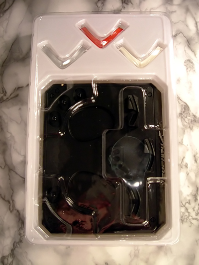 - un secondo blister con base bianca e coperchio trasparente contenente la basetta espositiva realizzata in pieno stile soc con tanto di nome del robot inciso su di essa e tre piastre pettorali intercambiabili di diversi colori (bianco, grigio argentato e rosso traslucido). Sia in questo blister che nel precedente il coperchio non è assicurato alla base con scotch come solitamente avviene per i gokin che meglio conosciamo.