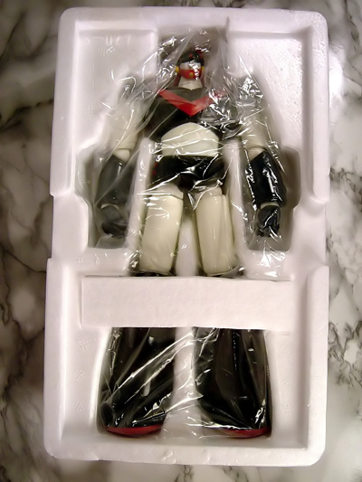 Si parte benissimo, la scatola è di una eleganza stupefacente. Completamente nera e di cartoncino ben più spesso e rigido dei normali soc Bandai, ha dimensioni relativamente contenute (28 x 23 x 6 cm). Sia la faccia anteriore che posteriore sono suddivise praticamente in due metà, la sinistra nero lucida e con suscritto il nome del robot, e la destra nero satinata,con margine delimitante non rettilineo ma con convessità rivolta a destra. Fa quasi tenerezzala storpiatura del termine limited in "limeted" che sotto al nome del robot specifica la tiratura limitata del modello, anche se l'errore è da considerarsi perdonabile (ancora mi ricordo la dicitura purple coler sulla scatola del Mazinkaiser Aoshima e il neologismo poseing sulla scatola dello Shin Getter 2 sempre di Aoshima) e al di sotto di essa la scritta collectible product (prodotto da collezione) conferma la natura selezionata dell'oggetto. La faccia posteriore è esttamente uguale a quella anteriore. Sulle coste il vero tocco di classe è dato dalla presenza di sigilli con suscritto il nome del robot a chiudere la scatola (2 per lato) al posto del normale scotch cui siamo solitamente abituati. Quasi dispiace doverli staccare nel momento in cui si apre la scatola, ma se vogliamo proseguire la recensione non abbiamo scelta............ In tutto ciò risalta la senazione di spaventosa pesantezza della confezione nel momento in cui la si soppesa tanto da avermi fatto sospettare che nella scatola arrivatami dalla Corea fosse alloggiato un mattone invece del modello.