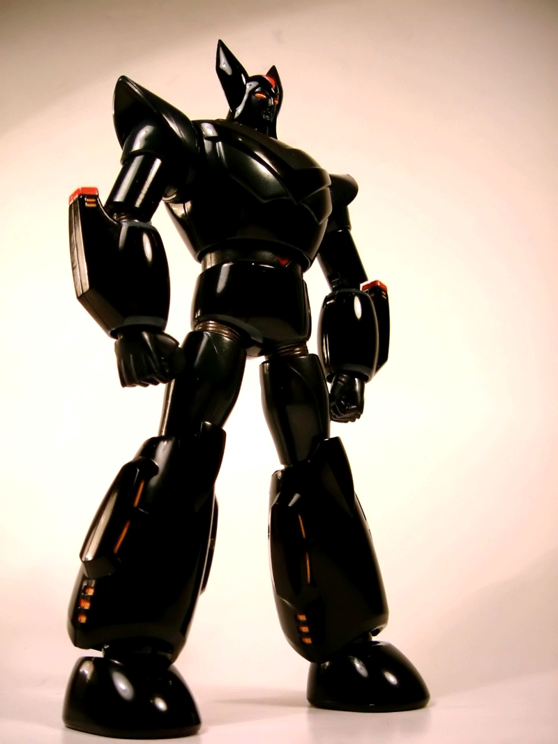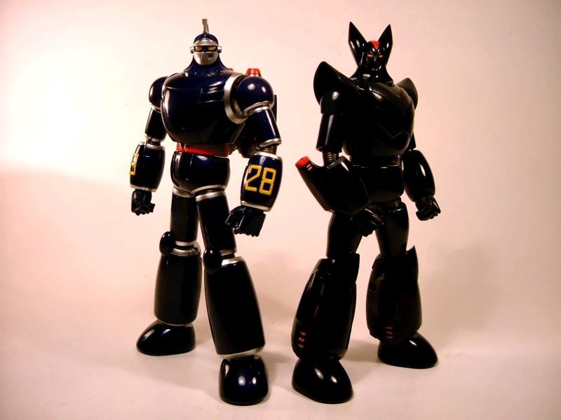 Il peso della scatola prometteva bene, quello dei modelli ovviamente non delude. Il T28 pesa ben 465 grammi per un'altezza di 18 cm ed è quasi interamente in metallo dal momento che le sole parti in plastica sono le cosce, gli sportellini sulla parte posteriore delle gambe, la cintura rossa, la testa e le spalle. La verniciatura è ottima e colpisce molto il bellissimo tono di blu scuro metallizzato che è stato usato. Dispiace non poco dover constatare la discrepanza di colore, apprezzabile ad una osservazione attenta e messa impietosamente in risalto da più di una delle foto con flash fatte al robot e reperibili in rete, tra le parti plastiche più opache e quelle metalliche, dotate di una maggior lucentezza. Anche le mani, in pvc, hanno un colore che si discosta un po' troppo da quello della livrea del robot. Probabilmente se fossero state fatte in plastica come per alcuni soc tale differenza si sarebbe notata meno. Ad ogni modo la vernice è ben distribuita e le imperfezioni presenti sono modeste, in linea con la tradizione Bandai. Davvero particolari i numeri 28 gialli stampati in rilievo sugli avambracci. I reattori, in plastica, sono applicabili sulla schiena con aggancio calamitato. Carino il sistema a molla per cui una volta applicati sulla schiena del robot, se ne possono far fuoriuscire lateralmente le ali con una semplice pressione sul corpo centrale. Passiamo adesso al capitolo posabilità. Partiamo col dire che in questo modello, nonostante la sua apparente semplicità, Bandai ha concentrato una serie di soluzioni tecniche che in parte ho apprezzato e in parte meno.Bellissimo il modo in cui sono state concepite le articolazioni delle caviglie che possono essere estratte così da permettere movimenti più ampi. Apprezzabili anche le articolazioni a scatto delle ginocchia che presentano escursioni estreme tali da consentire al robot di mettersi addirittura in ginocchio grazie alla presenza di sportellini a molla nella zona postero-superiore della gamba in cui la parte posteriore della coscia si va ad alloggiare nelle flessioni più spinte. Molto discutibile,invece, il sitema ad estrazione ideato per l'articolazione dell'anca, non a caso più di una persona si è lamentata per la scarsa capacità del modello di divaricare le gambe date le modeste escursioni laterali. Precisiamo che per dare maggior mobilità alle anche è necessario effettuare l'estrazione dello snodo, cosa che è praticabile con un sistema a due scatti, con il primo di questi, semplice da effettuare, si abbassano leggermente e in contemporanea le cosce e la parte inferiore del bacino,interposta tra il blocco anteriore e quello posteriore di quest'ultimo, con il secondo scatto in cui è necessario tirare molto forte (non temete, non si rompe nulla, tirate senza timore) si abbassa ulteriormente la coscia liberando lo snodo di circa mezzo centimetro così da garantirgli maggior libertà di movimento. Sia chiaro che nonostante l'estrazione dello snodo l'articolazione non guadagna assolutamente niente in lateralità ma guadagna moltissimo nei movimenti di estensione e flessione della coscia. Grazie alla concomitante capacità di rotazione di coscia e gamba si riesce così a dare al modello pose discretamente dinamiche anche se a mio avviso l'effetto visivo dell'articolazione dell'anca in corrispondenza della coscia estesa resta esteticamente molto discutibile. Il busto ruota rispetto al bacino con un sistema ad attrito in corrispondenza della cintura rossa. Le spalle,i cui movimenti di rotazione (a 360°) sono regolati da un sistema a scatto hanno totale libertà di movimento. I gomiti presentano un innovativo sistema tale da consentire flessioni estreme,praticamente a 180°. Purtroppo la notevole funzionalità di questa soluzione si scontra con una discutibilissima estetica per cui nelle flessioni più estreme la spontanea fuoriuscita di un piccolo segmento che unisce l'avambraccio al braccio si fa notare per bruttezza. Bello invece il sistema con perno a sfera con cui è stato concepito l'attacco della testa dal momento che data la caratteristica conformazione del robot questo non ha un collo ben definito. In questo modo è possibile l'uso di una testa intercambiabile con la possibilità di estendersi così da simulare le pose di volo del robot anche se a dirla proprio tutta, sarebbe stato allora giusto mettere in dotazione nella confezione uno stand apposito per questo tipo di pose. Passiamo a questo punto al Black Ox. Meno ricco in metallo rispetto al T28, anche il nerone si difende quanto a peso facendo spostare la lancetta della bilancia