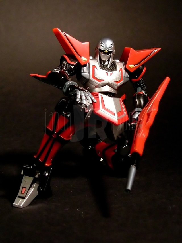 Altezza 10 cm, peso 26 grammi. Questi due numeri dovrebbero essere più che sufficienti per farvi comprendere come il Tobikage sia in realtà una action figure interamente in plastica. Non lasciatevi però ingannare, stiamo parlando di un oggetto validissimo, con un dettaglio e una verniciatura di una precisione decisamente meritevoli di encomio alla luce delle dimensioni ridotte. Per non parlare poi della posabilità assolutamente mostruosa, se questa è la versione trasformabile e quella contenuta nel gx-55 sarà la variante snodata del nostro buon Tobi non so davvero che cosa dovrò attendermi in termini di plasticità delle pose più di quanto questo gx-54 non offra già. Il figurino del Tobikage conta ben 19 punti di snodo (4 per arto, 2 a livello del tronco, 1 in corrispondenza del collo). Tutti gli snodi sono ad attrito. L'avampiede si flette sul tallone, la caviglia si piega in senso antero-posteriore e latero-mediale con escursioni abbondantissime. Il ginocchio si flette a 180 gradi. Le ampie oscillazioni di molte di queste articolazioni sono dettate dalle esigenze di trasformabilità e talora penalizzano inevitabilmente l'estetica, in particolar modo in corrispondenza del ginocchio dove la flessione superiore ai 90 gradi lascia scoperto in modo imbarazzante il perno cui si ancora la gamba (in altre parole il consiglio è di non piegare troppo le ginocchia quando si mette in posa il Tobikage). Gli inserti ai lati delle cosce sono parzialmente estraibili mostrando così gli alloggiamenti per i caricatori del fucile e la loro parte esterna si può flettere posteriormente consentendo in questo modo l'inserimento del robot nel Kurojishi. Le anche sono abducidibili a 90 gradi circa e permettono una rotazione addirittura completa alla coscia complice la mobilità degli elementi anteriore e posteriore del gonnellino. L'addome è articolato sia col bacino che col torace con movimenti di rotazione a 360 gradi su ambo le articolazioni. I coprispalle rossi sono parzialmente mobili e regolabili in altezza mentre le spalle sono abducibili a più di 90 gradi e rotabili completamente. Il braccio è rotabile a 360 gradi rispetto alla spalla ed i gomiti si flettono oltre i 90 gradi. Anche i polsi sono ben mobili, con movimenti di estensione più che soddisfacenti. La testa, infine, ha buoni movimenti di flessione e totale libertà in rotazione. Insomma, una bella action figure in cui le necessità di trasformazione hanno inevitabilmente condizionato la virtuale assenza di metallo, compensata da una posabilità decisamente strepitosa. Ma andiamo pure avanti, il Leone Nero ci attende....