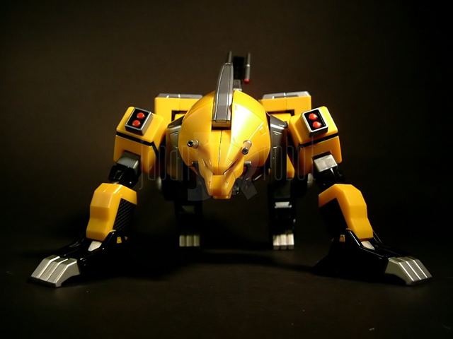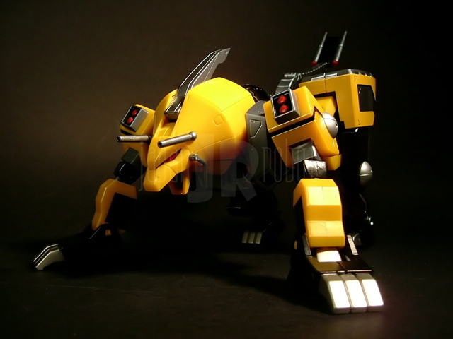 Si estrae il Kurojishi dal tanto vituperato blisterino e per gli amanti della zama la musica cambia, in modo radicale. La sensazione di pesantezza trasmessa al nostro leoncino è relativamente soddisfacente, 414 grammi per 17 cm scarsi di altezza non sono pochi. Sono in metallo i piedi (sia la parte gialla che quella nera), gran parte del tronco (la parte nera più precisamente, bacino e tutto il dorso tanto per intenderci) e gli inserti neri sugli avambracci che vanno a formare le zampe anteriori del leone. Il resto è in plastica. Basta applicare sulla schiena la coda ed il nostro Black Lion è completo. Capitolo verniciatura: non presenta particolari imperfezioni e si conferma perciò in linea con la tradizione Bandai, ma ancora una volta non posso esimermi dal constatare come la diversa tonalità del giallo nelle parti composte da materaili diversi (piedi vs resto del corpo) stoni seppur in modo meno sensibile di quanto osservato in passato. In generale il giallo risulta in più di una parte un po' troppo piatto (complice la verniciatura in pasta), ed è un vero peccato dal momento che con una cura maggiore e l'accortezza di usare qualche linea di pannellatura in più in alcune sedi come la criniera del leone, le spalle o le anche, il risultato finale sarebbe stato decisamente diverso. Piccola curiosità: le appendici sui lati delle anche, nere sul modello, appaiono per motivi a me ignoti di colore giallo nelle foto presenti sulla scatola. La posabilità non è certo quella del Tobikage essendo peraltro condizionata dalla necessità di conversione a leone, ma nel complesso risulta soddisfacente. Le caviglie hanno una buona inclinazione consentita dall'estrazione della parte gialla dal resto del piede dal quale è parzialmente svincolata. Le ginocchia sono a scatto e si flettono a poco meno di 90 gradi. La coscia ruota liberamente rispetto all'anca e quest'ultima, complici i limiti imposti dalla trasformabilità, non ha escursioni laterali ma solo la possibilità di flettersi anteriormente ed estendersi posteriormente (movimenti governati da una articolazione ad attrito peraltro rigidissima). La spalla è flessibile anteriormente come articolazione ad attrito funzionando invece a scatto in rotazione. Il braccio, all'aggancio con la spalla, è abducibile a 90 e rotabile a 360 gradi. Il gomito, ad attrito, oltre a flettersi ad angolo retto, ruota liberamente svincolando parzialmente i movimenti dell'avambraccio da quelli del braccio. I polsi hanno una flessione discreta e l'applicazione delle mani è agevole anche se si fa una certa fatica a far impugnare con le apposite mani il cannone. La testa ha modesti movimenti di flessione mentre la rotazione è totale, risulta forse un po' troppo incassata nelle spalle e posizionata posteriormente. La trasformazione è meno semplice di ciò che si potrebbe pensare, almeno in parte nel senso che se gli arti superiori del robot sono agevolmente convertibili nelle zampe anteriori del leone, ben più complessa è la metamorfosi delle gambe nelle zampe posteriori. Abbastanza elementare invece "appallottolare" il Tobikage così da permettergli di incastonarsi nel petto del mecha leonino. A conversione effettuata il risultato estetico finale è decisamente buono, anche se condito da più di un ma. Prima di tutto mi corre l'obbligo di sottolineare come nei modelli a 4 zampe, in termini di posabilità Bandai non abbia fatto in questi ultimi anni particolari passi in avanti essendo il grado di mobilità di questo Kurojishi praticamente sovrapponibile a quello dei mecha (Land Cougar e Land Liger) che formano i piedi del gx-13 Dancouga. Scarsa o meglio, nulla, purtroppo, anche la mobilità della testa. Ok che la trasformabilità impone dei limiti ma di fatto la testa risulta bloccata e lo sguardo del leone costantemente rivolto in basso in posizione di carica. La bocca è apribile e anche qui ho trovato un difettucolo (questa volta ammetto di essere decisamente pignolo...): i denti sono piccoli e non verniciati, quasi inapprezzabili, e la nostra povera belva appare ad una prima superficiale occhiata tristemente sdentata. Pochi (perchè tali risultano anche nella serie) gli accessori: carina l'idea delle bocche di fuoco ruotabili del cannone del Kurojishi, qualche segno di distacco dalle sprue di troppo sulle armi del tobikage, intelligente l'uso del grigio invece che del cromato sulle lame dato il tipo di verniciatura del ninja. Stona un po' l'assenza di una basetta espositiva che, seppur personalmente trovo inutile, avrebbe viceversa fatto molto piacere ad altri appassionati.