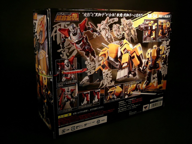 Luglio 2010, la lista si assottiglia... Il successore della "bomba" Daitarn 3 è uno tra i modelli da tempo più richiesti dagli appassionati del Sol Levante e va a ridurre ulteriormente quel gruppo di mecha maggiormente desiderati in versione Soul of Chogokin da cui Bandai ha generosamente attinto negli ultimi 4 anni. Stiamo parlando del Tobikage, o meglio di un terzo di esso. Temendo il flop economico cui l'avrebbe messa a rischio la proposta di un set enorme e conseguentemente ipercostoso, infatti, la casa nipponica ha in questo caso optato per una politica di mercato oculata e decisamente condivisibile, smembrando il progetto Tobikage in 3 soc separati, i gx-54, 55 e 56. Non a caso nell'anime, il Tobikage, mecha con le fattezze di un vero e proprio ninja (il nome della serie, trasmessa in Giappone tra l'ottobre 1985 ed il luglio 1986, è per l'appunto Ninja Senshi Tobikage, e cioè "Tobikage, il guerriero ninja"), è in grado di combinarsi con altri 3 diversi mecha antropomorfi per formare robot con le fattezze di animali rappresentati rispettivamente da un leone (Jyuuma "Beast Demon" Kurojishi o Black Lion), una fenice (Kuuma "Sky Demon" Houraioh o Phoenix Thunderhawk) ed un drago (Kaima "Sea Demon" Bakuryu o Burst Dragon). Niente di più facile, per Bandai, che proporre come gx-54 una versione trasformabile del Tobikage in coppia con il Kurojishi e, a seguire (settembre e novembre 2010) le accoppiate formate da un Tobikage non trasformabile ma iperposabile e l'Houraioh come gx-55 e lo Zerokage ed il Bakuryu come gx-56. Premesso che quindi l'uscita dovrà essere valutata nella sua globalità e che le somme potranno essere definitivamente tirate solamente a gx- 56 uscito, non possiamo certo esimerci dal dare un giudizio sul gx-54, primo modello del trio, immesso sul mercato alla fine dello scorso luglio....