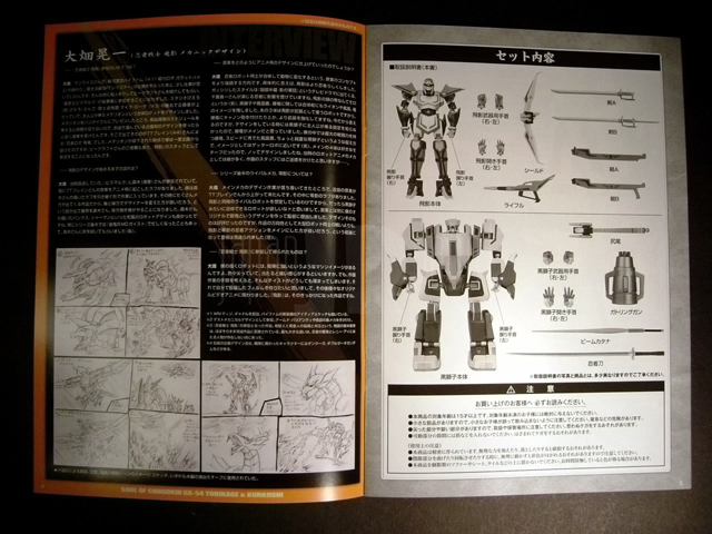 - Il libretto illustrativo, come al solito bello soprattutto nei bozzetti che ne caratterizzano le prime pagine, ma comunque diverso dalla maggioranza dei gx, con istruzioni in cui vere e proprie foto vanno a sostituire i disegni tecnici tipici di gran parte dei soc. Sarà che ero ormai affezionato alla concezione abituale dell'opuscolo che correda i chogokin di questa serie ma anche questo cambiamento, pur non rappresentando un peggioramento in senso stretto, non mi ha lasciato per niente entusiasta, anzi.....