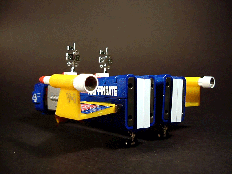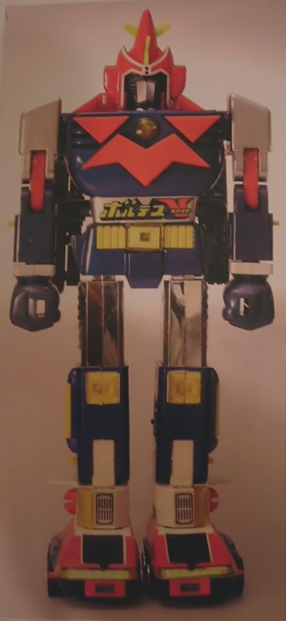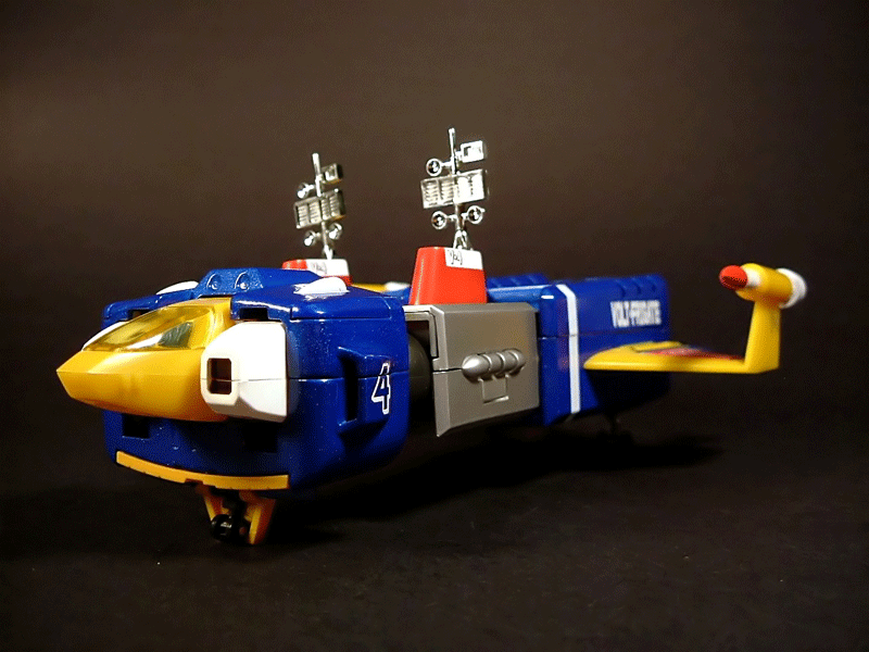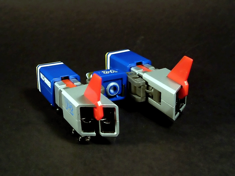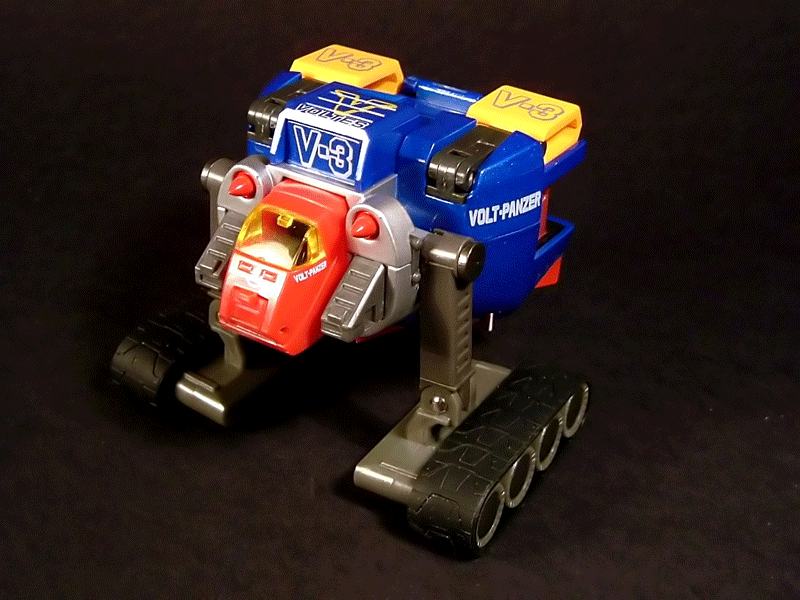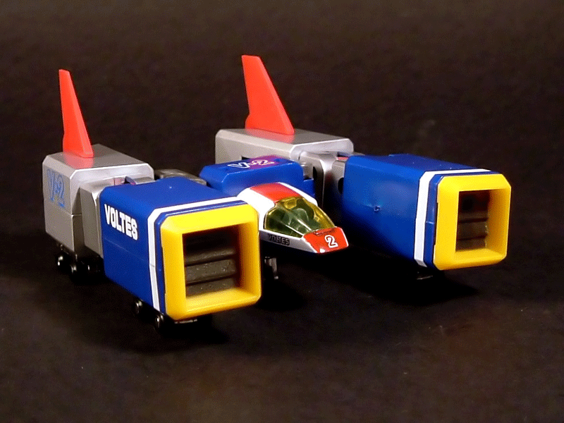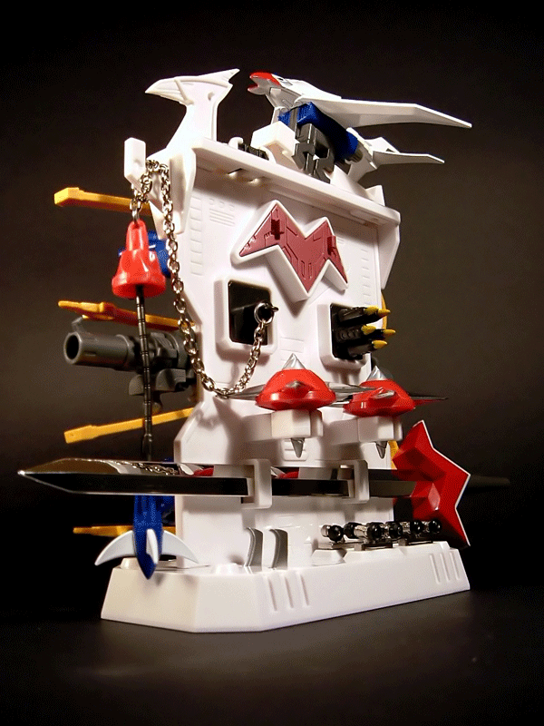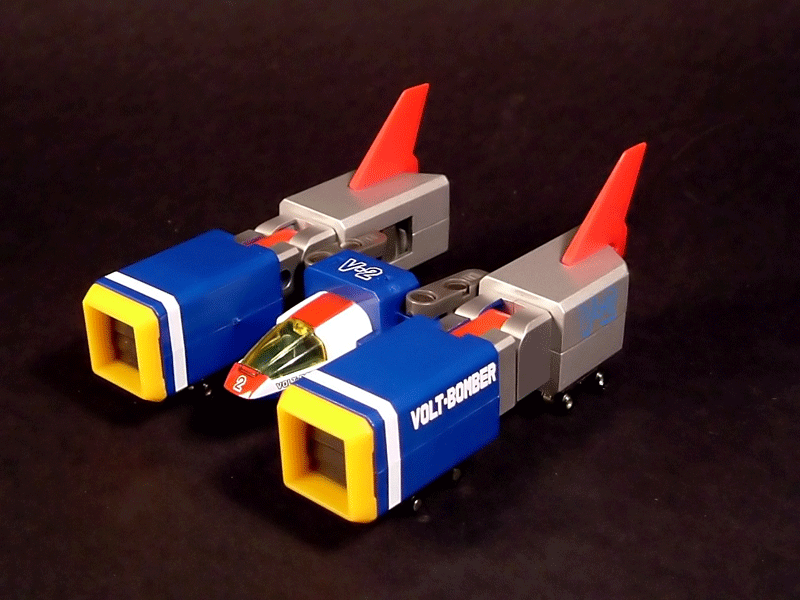 - grosso contenitore in polistirolo con mascherina in cartoncino che fa molto vintage in cui troviamo adagiati nei rispettivi alloggiamenti e protetti dal contatto con il polistirolo dalle abituali bustine di plastica trasparente: i 5 mezzi (Volt Cruiser, Volt Bomber, Volt Panzer, Volt Frigate e Volt Lander), lo sparviero meccanico, due roller plate, un supporto per permettere l'aggancio del componente aggiuntivo allo sparviero meccanico, la piastra da applicare sul petto con relativa spada ripiegabile ed una seconda piastra per simulare l'estrazione della spada dal petto quando si espone il robot facendogliela impugnare.