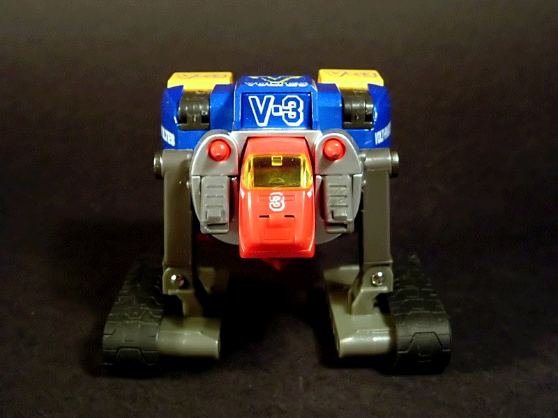 Il totale è quindi di 729 grammi per una altezza di 22 cm a robot assemblato. Non mi dilungo più di tanto sul contenuto in metallo e su dove questo si localizza dal momento che le suddette cifre ci indicano chiaramente un modello con un peso più che soddifacente e metallo concentrato principalmente a livello di tronco e gambe, esattamente come nel gx-31 classico. Le differenze di verniciatura rispetto alla versione normale sono invece più che lampanti e riproducono esattamente le sembianze del classico Volt in Box con una tonalità più chiara di blu e di giallo, bordature bianche sulla testa, ai polsi, sul margine inferiore della piastra pettorale e della fibbia della cintura e alle ginocchia, calottine delle cabine di pilotaggio trasparenti ma di colore giallo. E' invece rimasta simile, anche se non uguale, le tonalità di rosso. Ma in realtà le differenza più lampante nelle verniciature sono i nomi ed i numeri dei singoli mezzi stampati su ciascuno di essi,aspetto che richiama molto i vecchi vintage e che ha tenuto più di un collezionista lontano da questo modello anche se a onor del vero a robot assemblato, rimanendo molti di essi nascosti,non danno più di tanto nell'occhio. Anche lo sparviero meccanico ha una colorazione del tutto diversa, se infatti nel gx-31 è interamente rosso, in questo caso è invece completamente bianco con scritte rosse sulle ali. Diversa anche la colorazione dello stand espositivo, esattamente analogo e quindi molto funzionale e completo quanto quello classico dal quale si discosta, appunto, solo per caratteristiche cromatiche essendo bianco invece che nero. Fino a ciò che ho per ora detto questo gx-31v potrebbe benissimo essere considerato come un semplice recolor della sua variante classica ma come preannunciato, così non è essendo state apportate alcune modifiche sostanziali che, per esigue che siano, hanno cambiato in meglio un modello già di per se brillante. Sto parlando del difetto forse peggiore del gx-31, e cioè la sua instabilità. Nel 31v è stata infatti garantita maggior tenuta alle anche e in particolar modo alle caviglie del robot che è adesso in grado di mantenere pose estreme con gambe fortemente divaricate o con la possibilità di posarlo, grazie all'ausilio della spada, anche in ginocchio come le foto possono testimoniare. Insomma, una vera manna per gli amanti delle pose dinamiche, a maggior ragione se si considera che stiamo parlando di un componibile costituito da 5 veicoli diversi. Una altra sostanziale variazione è stata apportata agli arti superiori. Se infatti la versione classica del Voltes non è trasformabile in carro armato e questa si, lo si deve alla diversa progettazione delle braccia che in questo caso sono state ideate con lo stesso sistema che nel Combattler V gx-03 consente la flessione completa degli avambracci sulle braccia. La trasformazione in carro armato ha richiesto un'altra modifica strutturale, per la precisione sul Volt Panzer, in cui le braccia dei cingoli sono state allungate e rese estraibili in modo da dare adeguato sostegno a conversione effettuata. Purtroppo questa variazione ha comportato sul Volt Panzer un risultato estetico non proprio brillante: questo, quando esposto, per la maggior lunghezza dei bracci dei cingoli, appare un po' troppo "sui trampoli" e distaccato dal terreno. La trasformazione in carro armato è relativamente semplice e riproduce come modalità, l'analoga trasformazione del gx-03. Consigli per gli acquisti