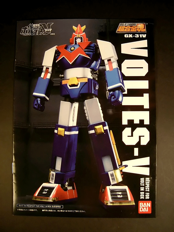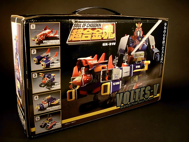 Nel 2008, a distanza di 2 anni dall'uscita del gx-31 Voltes V, Bandai torna a riproporre in versione alternativa lo stesso soggetto. Non si tratta in questo caso, come già avvenuto in passato, di una semplice ristampa o di un mero recolor, ma di un modello che si differenzia non solo cromaticamente ma anche strutturalmente rispetto al soc della serie regolare. La sigla scelta per questo nuovo Voltes è gx-31v dove la lettera v sta per Volt In Box. Il nome per esteso del modello è infatti: Voltes V Respect for Volt in Box. La traduzione italiana suona grossomodo come Vultus V, omaggio al Volt in Box. Questo modello è infatti stato proposto come omaggio al Voltes Volt in Box (famosa versione vintage dello stesso robot prodotta da Popy nel 1977) e ne riproduce non solo il tipo di verniciatura, ma anche il particolare ed originale packaging. Come detto questo gx-31v non è quindi un semplice recolor del ben noto gx-31, ma si differenzia da quest'ultimo anche dal punto di vista tecnico come dimostra la sua maggior stabilità a livello di anche e (soprattutto) caviglie, arcinoto punto debole del peraltro ottimo soc regolare. Questa ed altre innovazioni che non vi voglio anticipare per costringervi a leggere tutta la recensione (oggi mi sento cattivello, eh eh...) giustificano una nuova recensione da aggiungere al già eccellente lavoro fatto da Michele per il gx-31 rispetto al quale cercherò quindi di concentrarmi solo sulle differenze che distinguono i due modelli. A questo punto siamo pronti per partire.....
