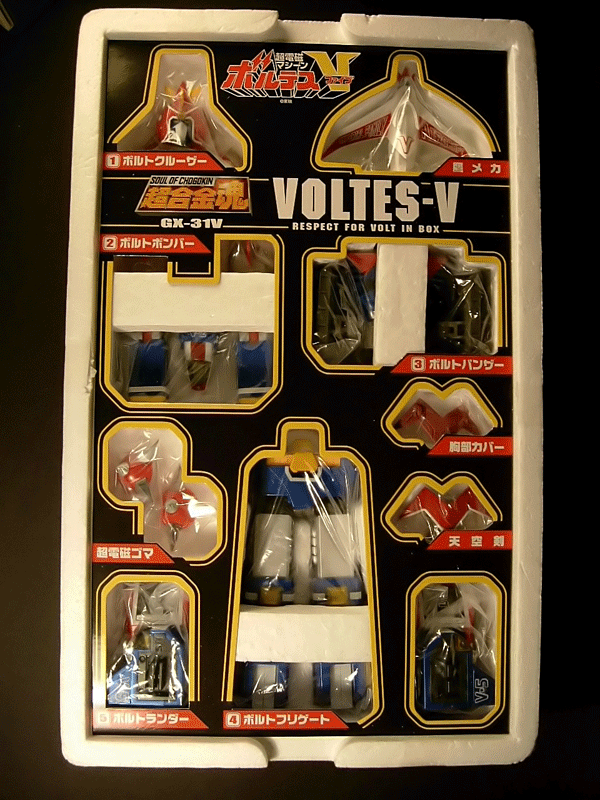- grande blister in plastica dove trovano alloggiamento: 4 paia di mani (aperte, chiuse a pugno, semichiuse e chiuse con foro centrale per l'impugnatura della spada), lo stand espositivo suddiviso in 7 componenti separate, due paia di carrelli rispettivamente con 4 e 2 ruote (per il Volt Bomber), la grande spada (Tenkuken), il componente aggiuntivo che nell'anime lo sparviero meccanico deposita nella schiena del Voltes, un paio di corde megaelettronucleari, la catena spaziale, un sistema sparante per simulare il lancio della catena, il bazooka (a differenza del gx-31 in questo caso non è estraibile dall'avambraccio ma lo si deve applicare come parte opzionale), un paio di placche con relativi perni per l'aggancio delle mani da applicare agli avambracci e una placca che simula le bocche di fuoco della torpedine solare sempre applicabile agli avambracci.