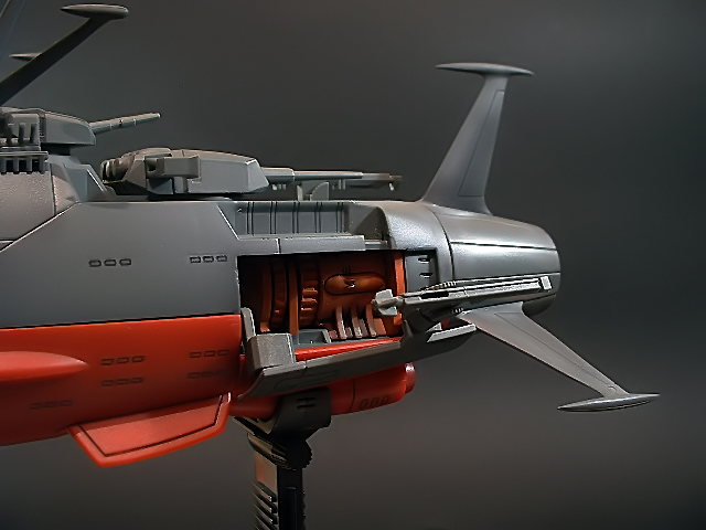 La Bandai ha dotato questa astronave di luci, suoni, aperture di vani e movimenti per le batterie di fuoco, ma andiamo con ordine. Sul lato destro della Yamato sono posti 7 tasti, 3 in prossimità della prua e 4 nella parte centrale quasi a livello chiglia, questi pulsanti servono per riprodurre i suoni e le accensioni delle luci. Sempre sulla fiancata destra, trovano alloggio anche due rotelline, queste ultime servono a dare il movimento alle batterie di cannoni del ponte centrale ed a quelle più piccole laterali. Entriamo nel dettaglio delle singole funzioni partendo dai tasti a prua. Premendo il primo si avrà la riproduzione di suono con relativa illuminazione del cannone ad onde moventi, arma usata per dare il colpo definitivo ai nemici nella serie animata. Il suono riproduce la fase di caricamento fino all’esplosione del colpo, la luce parte contemporaneamente e va ad intermittenza nella prima fase, finendo con il massimo bagliore in quella finale dell’esplosione, il tutto ha una durata di circa 14 secondi. Il secondo ed il terzo tasto riproducono il rumore delle batterie di cannoni centrali e laterali al momento dello sparo, il primo ha una durata di 8 secondi, mentre l’ultimo è di soli 3. Passiamo ora ai tasti della parte centrale della nave…con la pressione del primo si otterrà il suono del movimento della Yamato, durata 6 secondi. Pigiando il secondo si accenderanno le luci dei tre motori con relativo suono di accensione, il tutto rimarrà udibile/visibile per 7 secondi circa. Terzo e quarto tasto sono dedicati ai suoni e luci degli allarmi di apertura hangar per uscita caccia e per allarme ponte di comando, rispettivamente della durata di 5 e 6 secondi, tutti questi suoni sono l’esatta riproduzione di quelli usati nella serie tv. Sulla nostra Yamato ci sono anche parti apribili che mostrano la riproduzione di alcuni interni della nave. Mediante pressione di un piccolo tasto a prua, lato destro, si apre un portello sul lato sinistro, la sua apertura permette la visone dell’alloggiamento missili e dei particolari meccanici del cannone ad onde moventi con relativo pistone per lo sparo, il movimento di unione è comandato da un cupolino posto sul ponte del modello. Sotto alla chiglia troviamo invece due portelli apribili per l’uscita dei caccia da combattimento Cosmo Tiger, mentre sulla fiancata posteriore sinistra abbiamo l’apertura per visione hangar, dove è addirittura possibile alloggiare i piccoli aerei in dotazione. Subito in fianco è posizionato il pannello che permette di guardare il dettaglio del motore della Yamato, può anche essere fatto ruotare grazie all’abbassamento di una delle due piste di lancio caccia. Per concludere la serie di pannelli apribili Bandai a ricavato un’apertura per contenere uno dei Cosmo Tiger, questo è posto sulla fiancata sinistra del modellino, più o meno al centro della struttura che ospita la torre di comando ed il fumaiolo centrale. Piccola nota per quest’ultimo, esso è dotato di una piccola leva sulla parte destra, alzandola usciranno i missili nascosti al suo interno. Come ultima sorpresa “dinamica” c’è la fuoriuscita delle ali laterali, la loro apertura avviene a scatto, il comando è posto sotto alla chiglia della nave “mimetizzato” in una delle sporgenze della struttura dello scafo. L’ultimo passaggio della recensione è dedicato al display stand, esso è composto da due sostegni dove poter collocare la Yamato, nella parte inferiore troviamo il Cosmo Cleaner ed una piccola piattaforma con tanto di targhetta nominativa del modello, su di essa è possibile esporre i caccia Cosmo Tiger in formazione completa. Lo stand occupa un discreto spazio, la sua lunghezza è di 23 centimetri ed eleva da terra la Yamato ad un’altezza di circa 10.