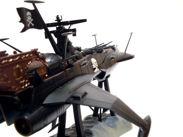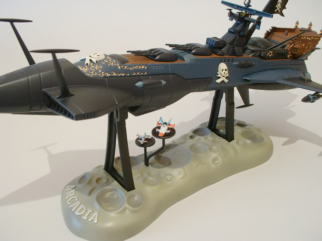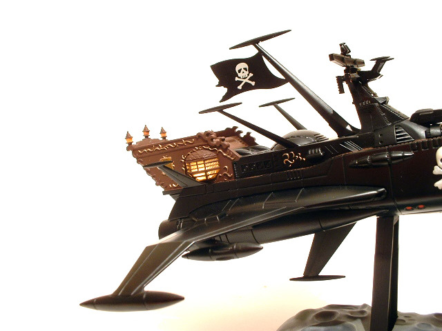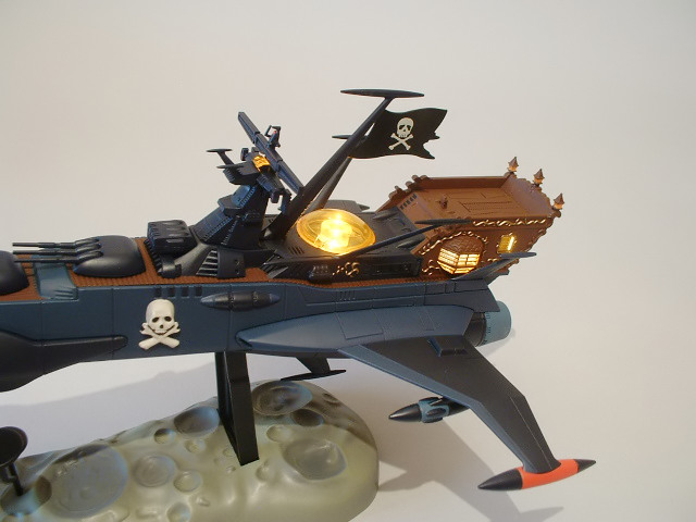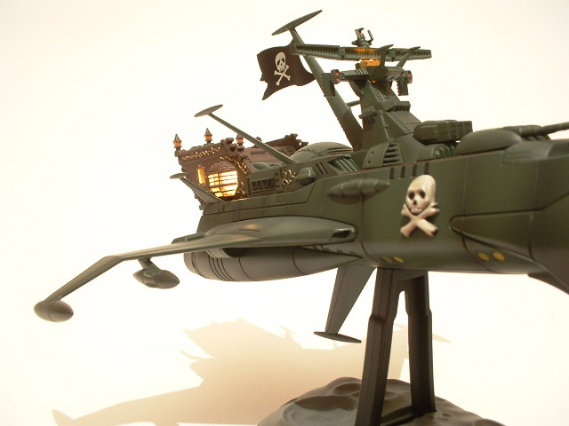 L’astronave è molto ben costruita, si ha una bella sensazione di solidità nel maneggiarla, gli unici punti critici sono le due antenne di prua, sono molto sottili e si potrebbe incorrere in una facile rottura, quindi è consigliabile toccare con cura questa parte del modellino. Molto belli i fregi dorati che adornano l’Arcadia, soprattutto quelli nella parte avanzata della nave, appena prima dei cannoni. Sopra il teschio simbolo dei pirati, ne troviamo due anche sui lati centrali della Death Shadow oltre a quello che campeggia sulla Bandiera. Le torrette dei cannoni ruotano e si alzano come per la precedente realizzazione, mentre la forma della torre di comando è molto più semplice e priva dei radar laterali. Leggermente diversa la Cabina del Capitano a poppa, niente bandiera nella parte superiore, tre i lampioncini di contorno e solo due finestre laterali in sporgenza. Nella parte sottostante della nave troviamo lo sportello per la fuoriuscita dei caccia, qui sistemato nella parte centrale e molto più grande rispetto al precedente, l’alloggiamento per le batterie che permettono l’illuminazione di alcune parti interne e nella parte posteriore il tasto per l’accensione. Le parti che s’illuminano sono quattro, la parte superiore della torre di comando, il cupolino posteriore insieme alla cabina di Harlock e naturalmente i motori, questi molto più grandi rispetto all’Arcadia precedente.