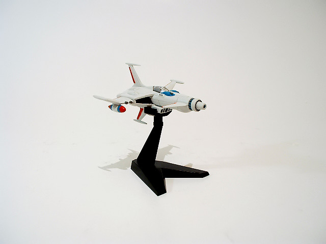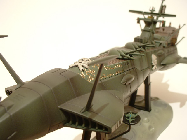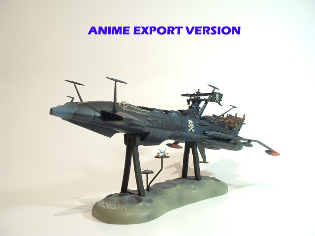 Ovviamente le versioni disponibili sono diverse, quattro per l’esattezza, TV Anime Version con i colori classici del cartone animato, Original Color Version – colorazione verde invecchiata come nel fumetto, Anime Export Version – colorazione classica ma invecchiata e per finire la Black Version – totalmente nera e con un extra item all’interno, il caccia di Harlock lungo ben 8 centimetri con tanto di piedistallo per l’esposizione!!! Le tre Edizioni Aoshima, Tv, Original e Black sono colorate molto bene, stupenda la versione verde invecchiata, mentre qualche imprecisione si è riscontrata sulla Anime Export, cosa che sembra accompagnare purtroppo ogni loro produzione. Diciamo subito che l’acquisto obbligato è quella della versione TV con i colori classici, io ho comprato anche la Original Color Version perché da piccolo avevo il modellino della Polystill proprio in quella colorazione……quanti ricordi………quindi per me acquisto di carattere nostalgico. La Black ha ragione di essere comprata solo se nella collezione è presente la versione nera della precedete Arcadia, mica si potrà lasciarla sola no?! L’edizione Anime Export risulta essere però più fedele ancora della TV Anime, i colori sono stati resi leggermente più scuri dando secondo me quel tocco di veridicità in più rispetto alla versione normale dove le differenze di tonalità tra blu scuro e chiaro sono più evidenti. Se si guarda attentamente la serie animata si nota molto bene che la colorazione dell’Arcadia è praticamente tutta blu scuro, fatta eccezione per la punta della nave che è di color azzurro chiaro. La ditta Anime Export ha poi aggiunto anche una leggera invecchiatura alla colorazione, particolare che purtroppo non si nota molto dato che il colore del modello è già di per se molto scuro.
