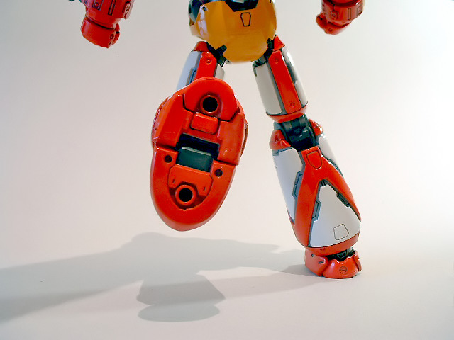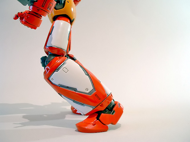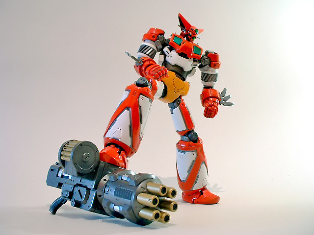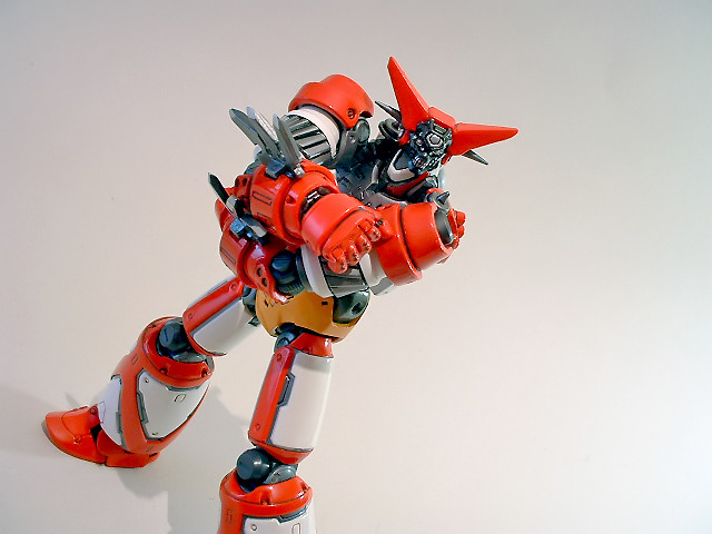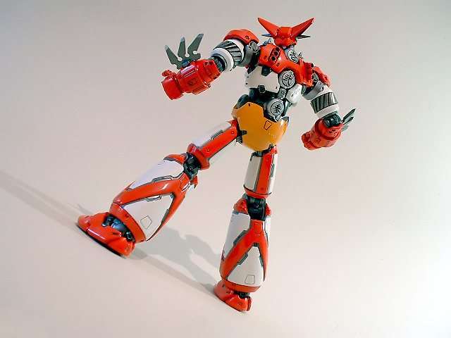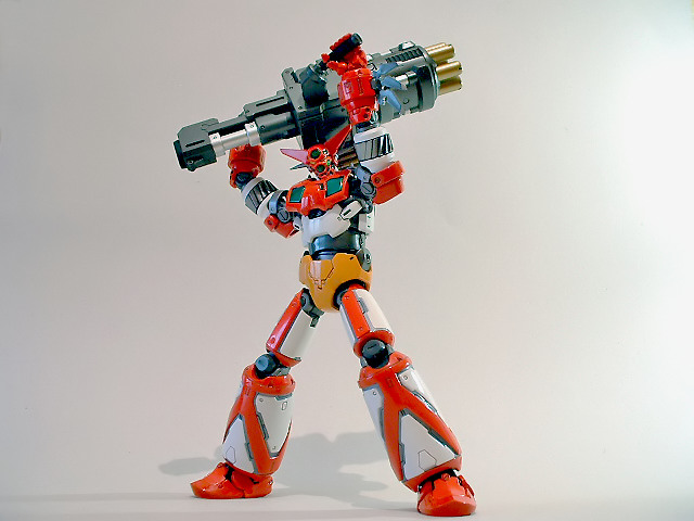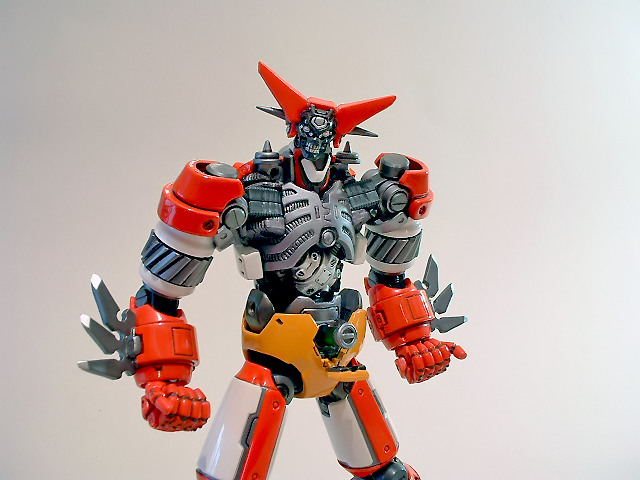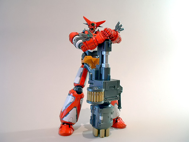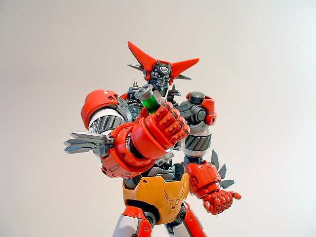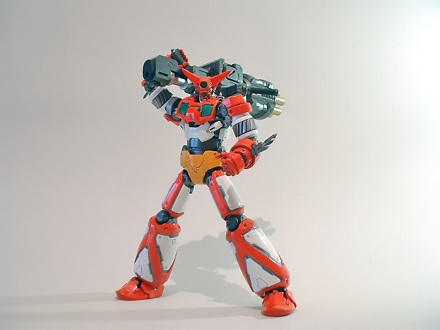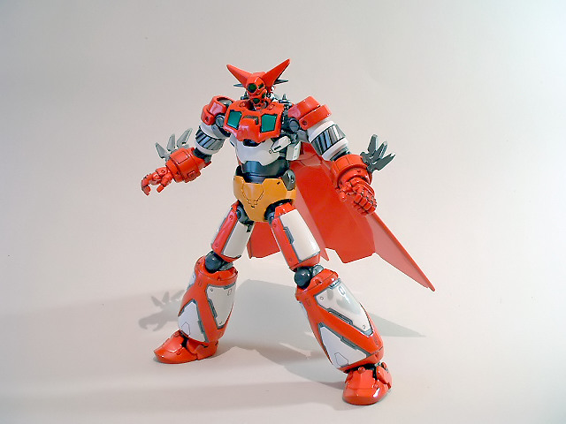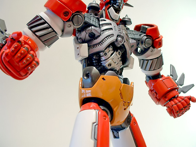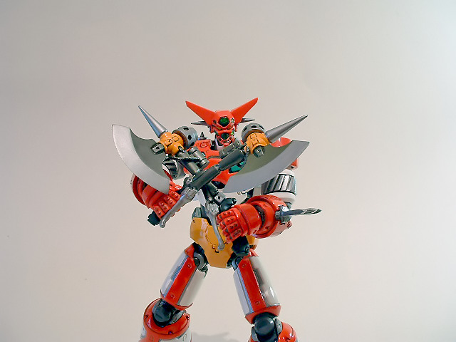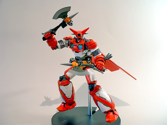 Il Getter 1 è, come per la versione Black, molto pesante e massiccio, composto quasi totalmente in metallo ad esclusione di alcune parti come la testa, le mani, le spalle, il mantello e le due asce, gioia per i puristi della sacra zama ^___^ e non. La verniciatura è abbastanza curata, sulla mia copia ho rilevato solo due piccole imprecisioni nel retro delle gambe, le plastiche si mescolano cromaticamente molto bene con tutto il resto della verniciatura su metallo. L’effetto visivo generale è di assoluta linearità su tutto il modello…..change Gettaaaaa ooone!!!………..La posabilità è ovviamente identica al predecessore, le caviglie s’inclinano, le gambe godono di una buonissima apertura e rotazione, dal ginocchio in giù è possibile ruotare l’arto. Anche per le braccia c’è molta libertà di movimento, rotazione a 360 gradi totale, anche per i soli avambracci, possibilità di avanzamento avanti e indietro delle spalle, anche se limitate un pochino dalla piastra pettorale, mani posizionabili e leggermente diverse da quelle viste nel Getter Black. Sono un tantino più robuste e permettono una presa molto più salda dei due Tomahawk e del gigantesco Machine Gun!!! La stabilità è buona anche con il mantello applicato, se vi ricordate bene questo era un difetto della versione Black, il Getter tendeva a sbilanciarsi all’indietro a causa del notevole peso dell’accessorio. Fewture ha risolto questo problema alleggerendo molto il mantello del Getter 1 rendendolo molto sottile e schematico nella forma, personalmente lo trovo molto brutto.