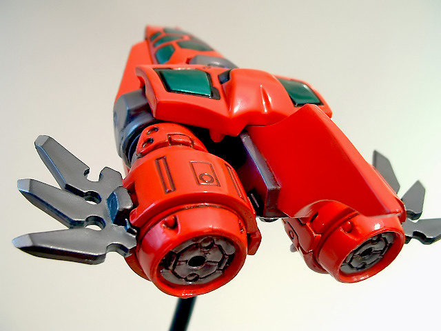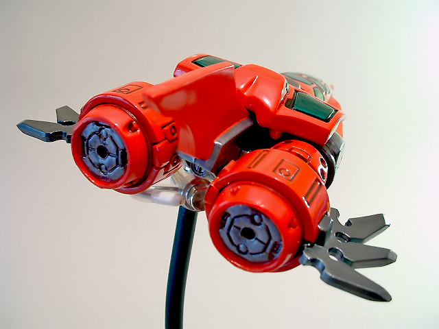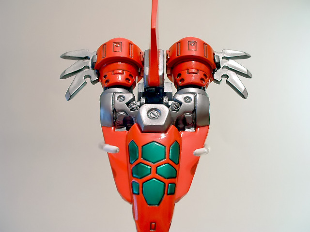 Come detto in precedenza nella confezione è presente la Getter Machine 1, molto bella esteticamente, nella parte terminale sono presenti gli stessi avambracci del Getter con i cutter laterali. La piastra pettorale qui funge da cupolino di copertura per la cabina di pilotaggio, è possibile la sua rimozione per visionare il posto di guida. Anche sulla Getter Machine gli avambracci possono essere ruotati e aperti all’esterno, questo permette una piccola simulazione di aggancio con le altre due Getter Machine. Molto pesante e quasi interamente in metallo, nella parte sottostante troviamo il simbolo circolare come quelli che sono posizionati sulla schiena del Getter, ovviamente qui il carattere è quello del numero 1.