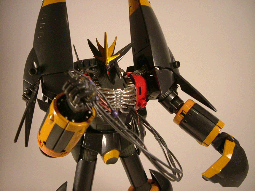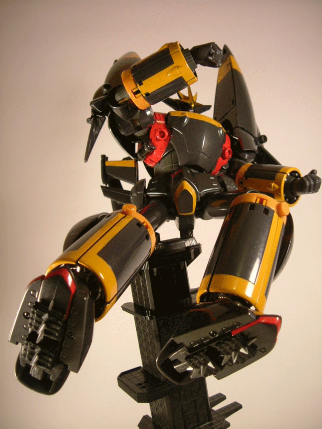 La posabilità del modello ha dell'incredibile, complice la notevole mobilità sia in senso laterale che antero-posteriore dell'articolazione dei femori sul bacino e la presenza di una articolazione a scatto tra quest'ultimo e il torace tale da permettere movimenti di torsione del tronco. Le ginocchia si flettono notevolmente e anche le caviglie sono libere di piegarsi abbondantemente. Personalmente ho preferito esporre il mio modello con i piedi trasformabili in quanto ho dovuto constatare una certa "mollezza" (comunque niente di eclatante) delle caviglie usando i piedi intercambiabili sostituibili a quelli trasformabili. Di fatto il problema non si è presentato per altre persone che hanno acquistato il modello. Anche il movimento delle braccia è liberissimo, soprattutto perchè le grosse spalle hanno uno snodo indipendente da quello presente tra torace e braccia così da non vincolare il movimento degli arti superiori. La mobilità della testa è discreta. Un difetto riconosciuto rispetto alla controparte animata è sicuramente l'eccessiva snellezza dei femori rispetto alla gamba, il Gunbuster dell'anime ha infatti una coscia ben più massiccia, ma ovviamente l'obbligo di riprodurre la trasformazione del modello ha reso necessario questo compromesso. Come detto la colorazione è molto buona, con i soliti piccoli difetti della grande produzione Bandai e soprattutto la trasformazione è concepita in modo tale da non provocare graffi sulla vernice. Le grandi spalle hanno nella loro parte interna sportellini che danno adito ad alloggiamenti rispettivamente per: a destra il grande mantello, a sinistra l'ascia e la mazza (anch' essa accorciabile per la sistemazione nel relativo scompartimento con un dispositivo a cannocchiale), armi che peraltro il GunBuster non usa nell'anime (ma che probabilmente erano state concepite nei primi disegni dello studio Gainax). Di grande impatto visivo la posa con gli sportelli dei buster colliders aperti.